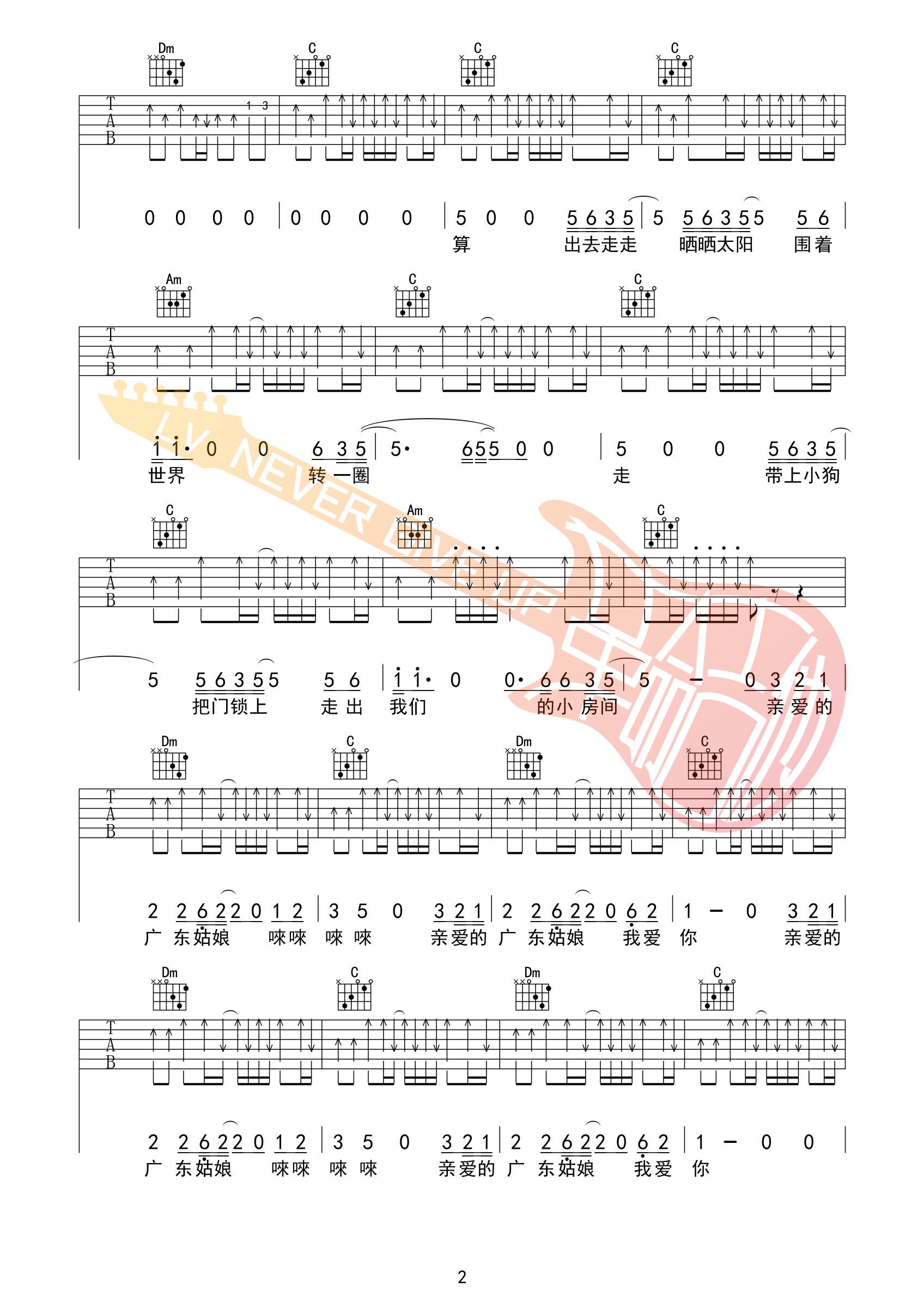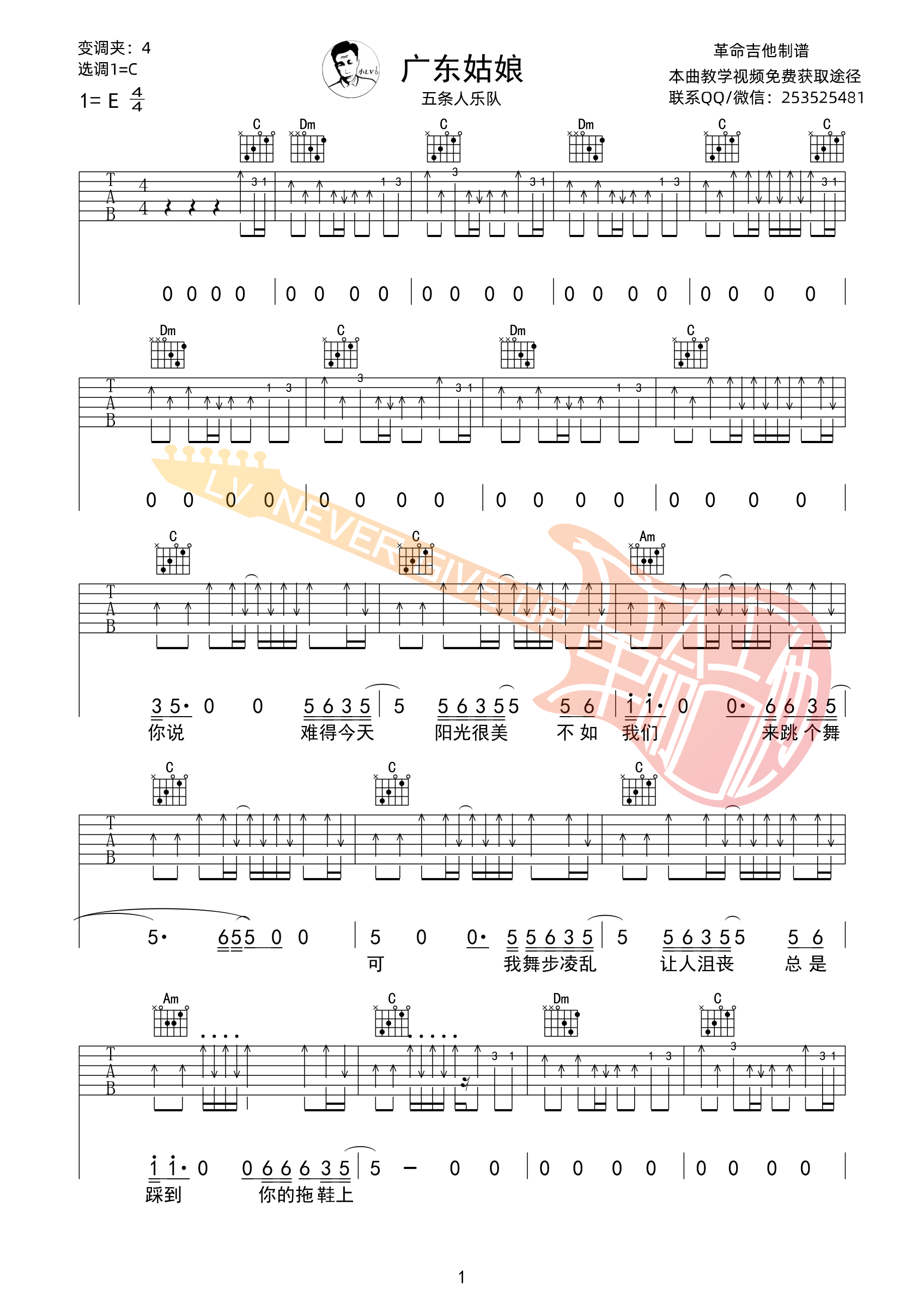 曲谱介绍: 五条人《广东姑娘》吉他弹唱谱,采用C调指法编配,革命吉他编配出品,共有4张高清图谱。