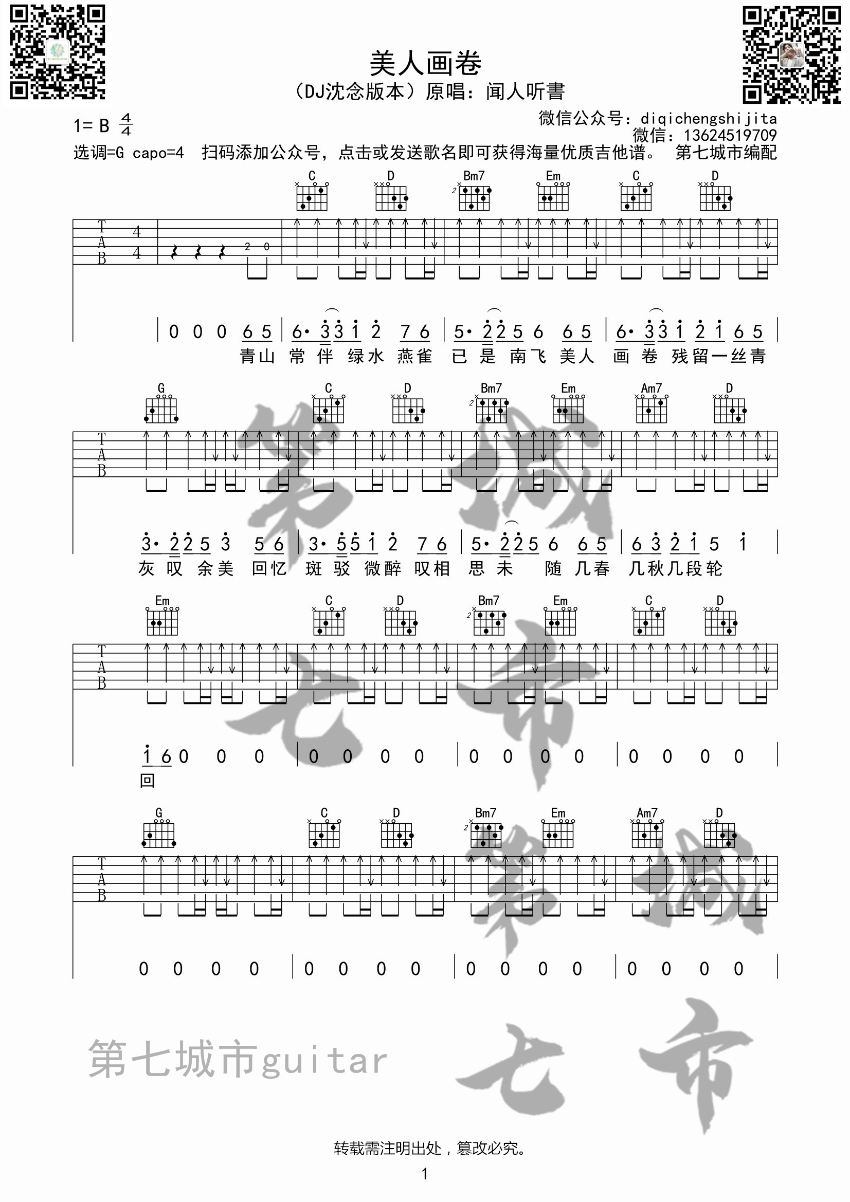 曲谱介绍: 闻人听书《美人画卷》吉他弹唱谱,采用B调指法编配,第七城市编配出品,共有3张高清图谱。