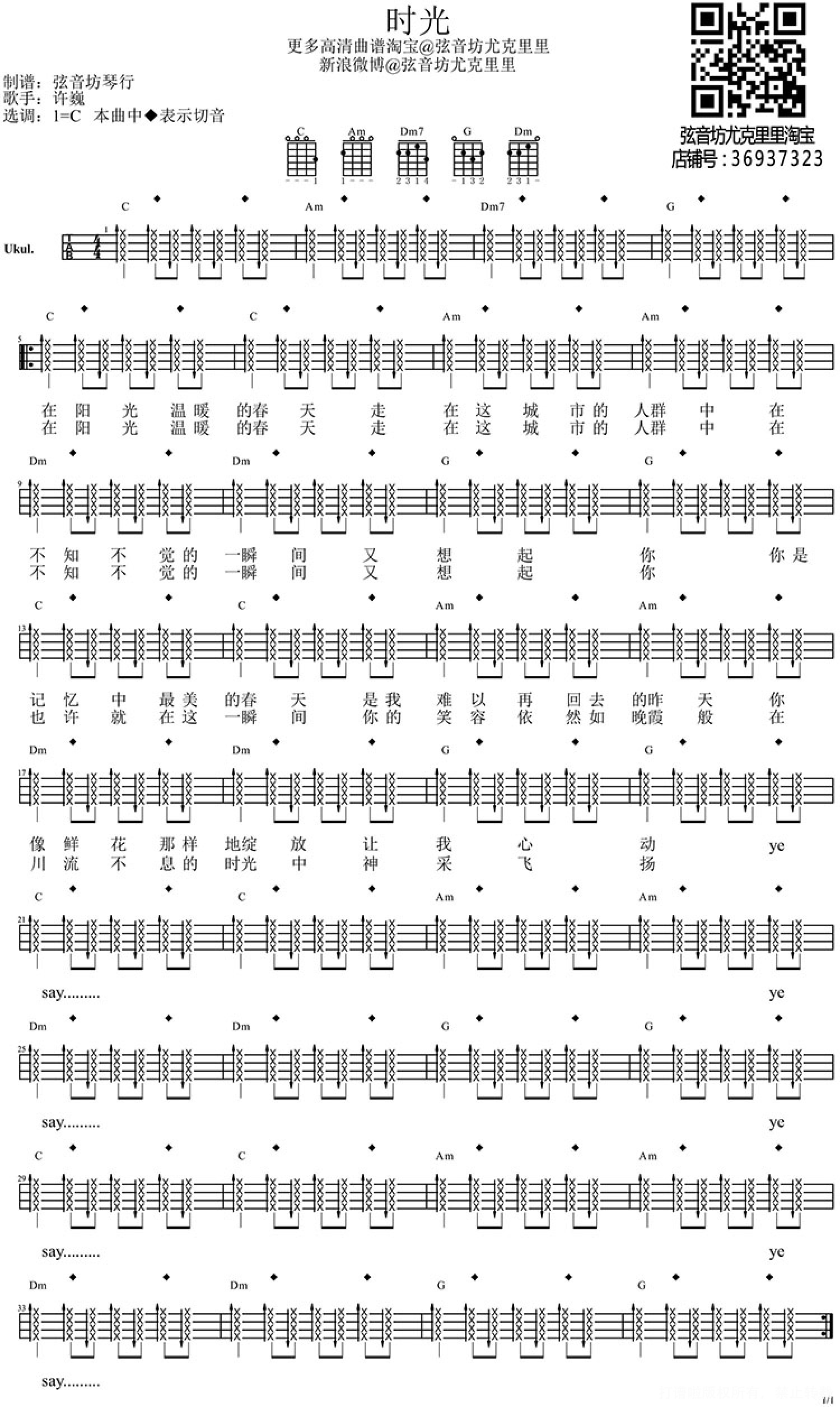 曲谱介绍: 时光尤克里里谱时光弹唱教学