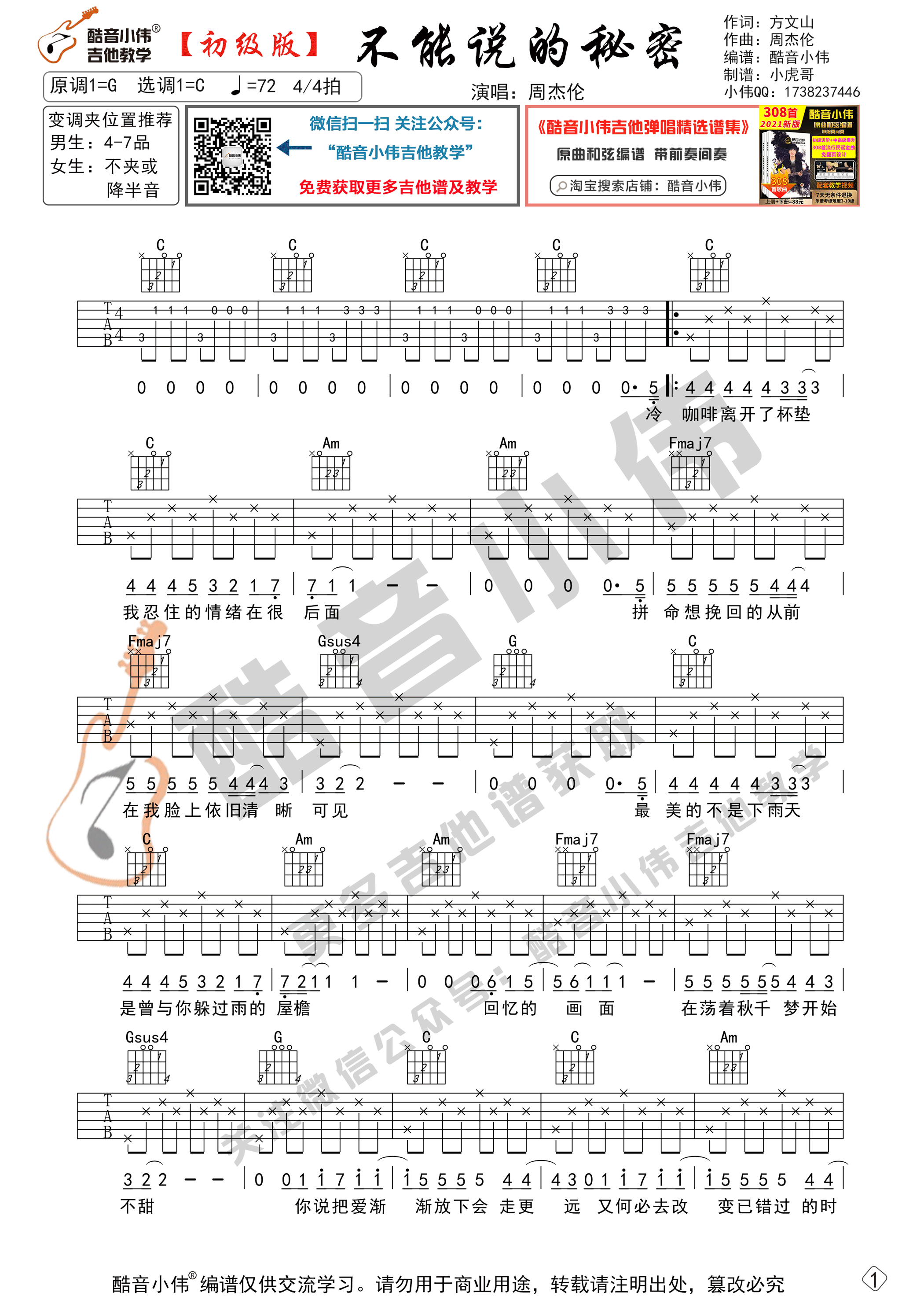 曲谱介绍: 曲谱适合初学者练习,选用C调指法,变调夹的位子可以根据我的推荐来选择。使用八分音符分解伴奏型弹奏,先弹奏会曲谱,再清唱会,然后弹唱结合一起练习。《不能说的秘密》是周杰伦演唱的一首歌曲,歌曲以英式摇滚曲风,谱出带点悬疑色彩的浪漫爱情故事,用不同以往坚毅笃定的钢琴弹奏方式,从头不间断地延续着孤独沧桑的气息,简单却深植人心,歌曲最后的结尾用钟声来表达对校园的怀念。