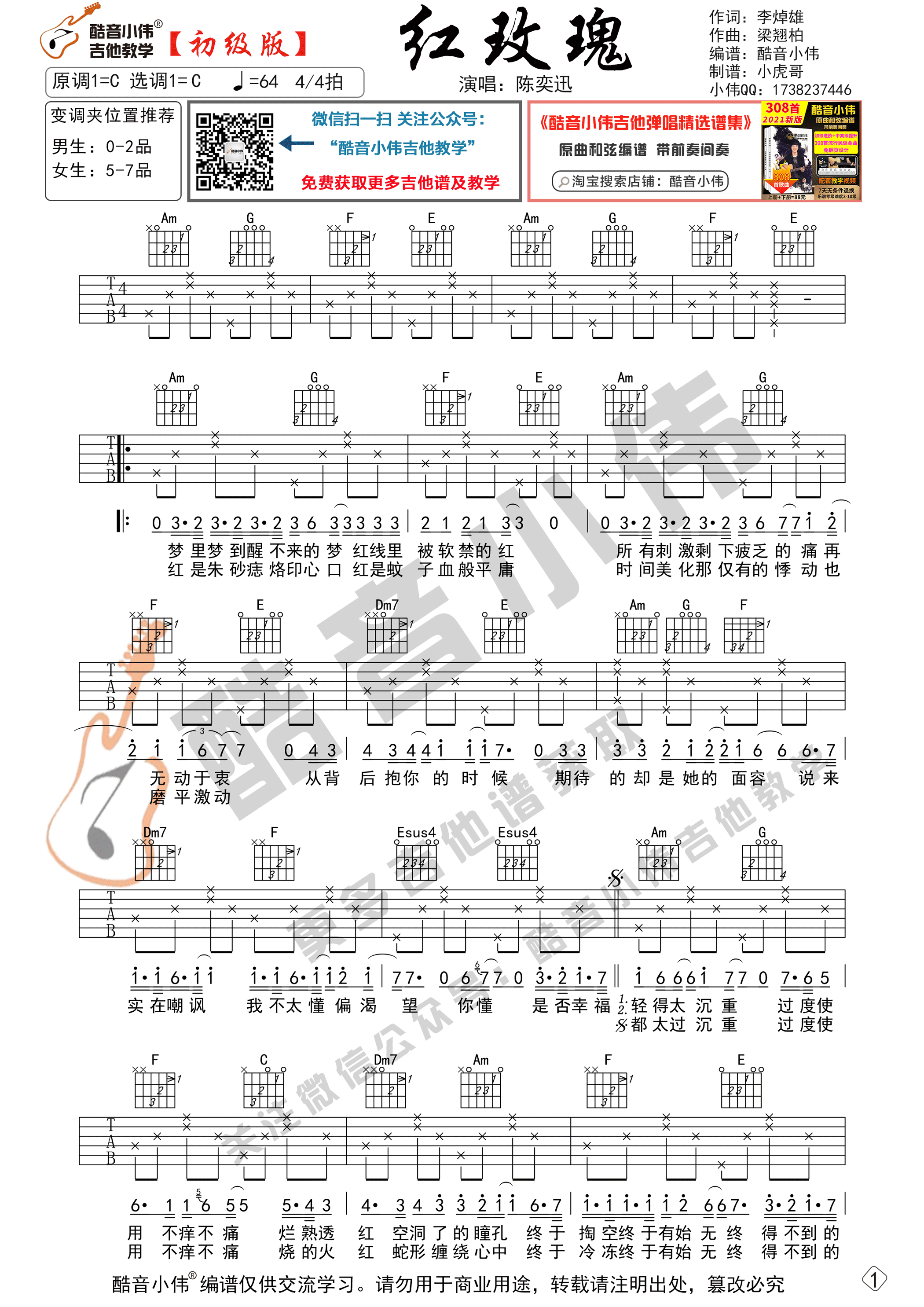 曲谱介绍: 曲谱适合初学者练习,选用C调指法,变调夹的位子可以根据我的推荐来选择。使用八分音符分解伴奏型,先弹奏会曲谱,再清唱会,然后弹唱结合一起练习。《红玫瑰》吉他谱采用了C调指法,由酷音小伟吉他做谱完成。由陈奕迅演唱,歌曲叙述我们经常会面临着一种两难选择,我们停下脚步纠结,在内心无数次的衡量对与错,我们怕选错,怕失去,也怕后悔。