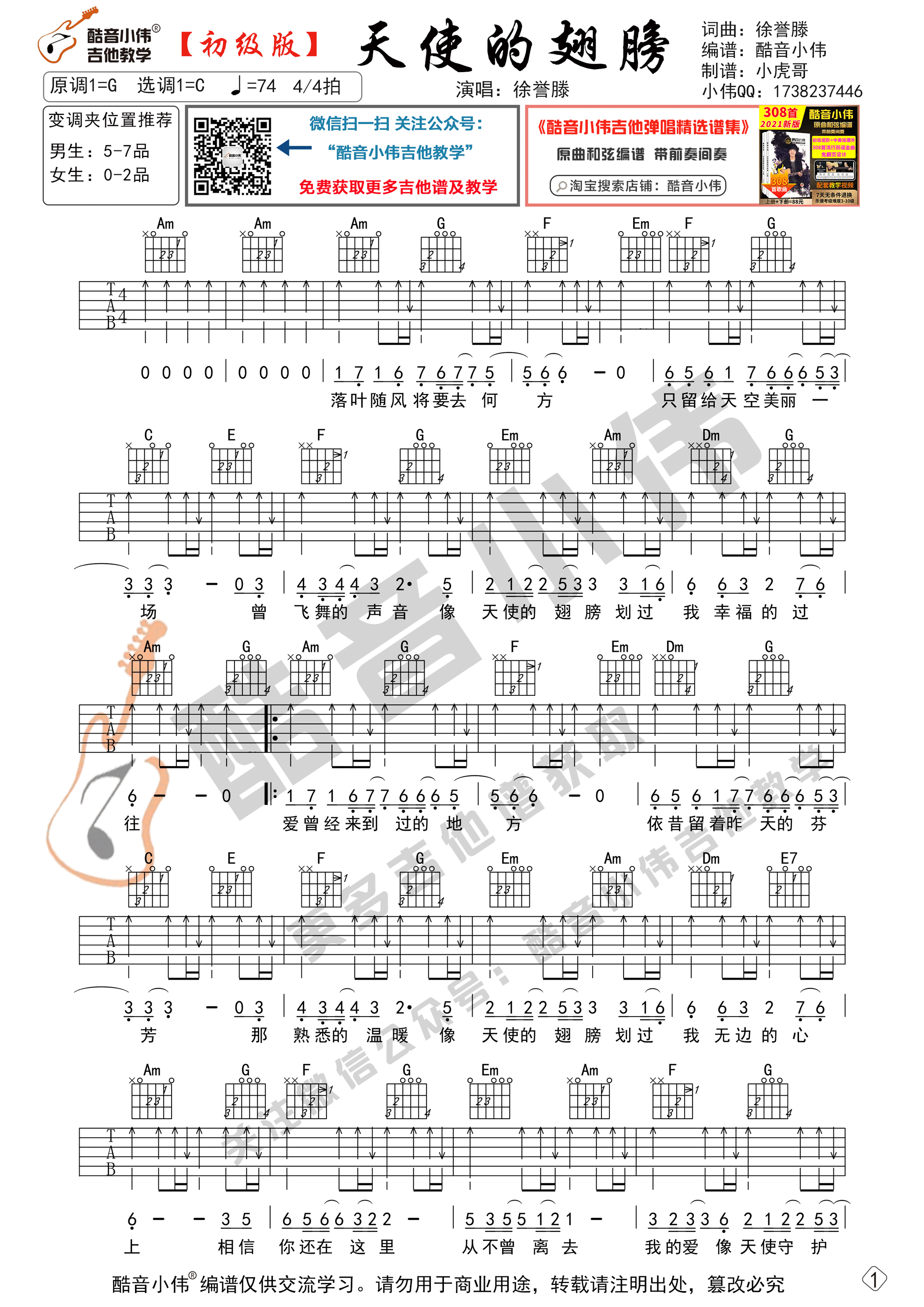 曲谱介绍: 天使的翅膀吉他谱采用了C调指法,谱适合初学者进阶练习,选用C调指法,变调夹的位子可以根据我的推荐来选择。使用八分音符、十六分音符扫弦伴奏型弹奏,先弹奏会曲谱,再清唱会,然后弹唱结合一起练习。《天使的翅膀》是徐誉滕作曲,安琥演唱的一首歌。