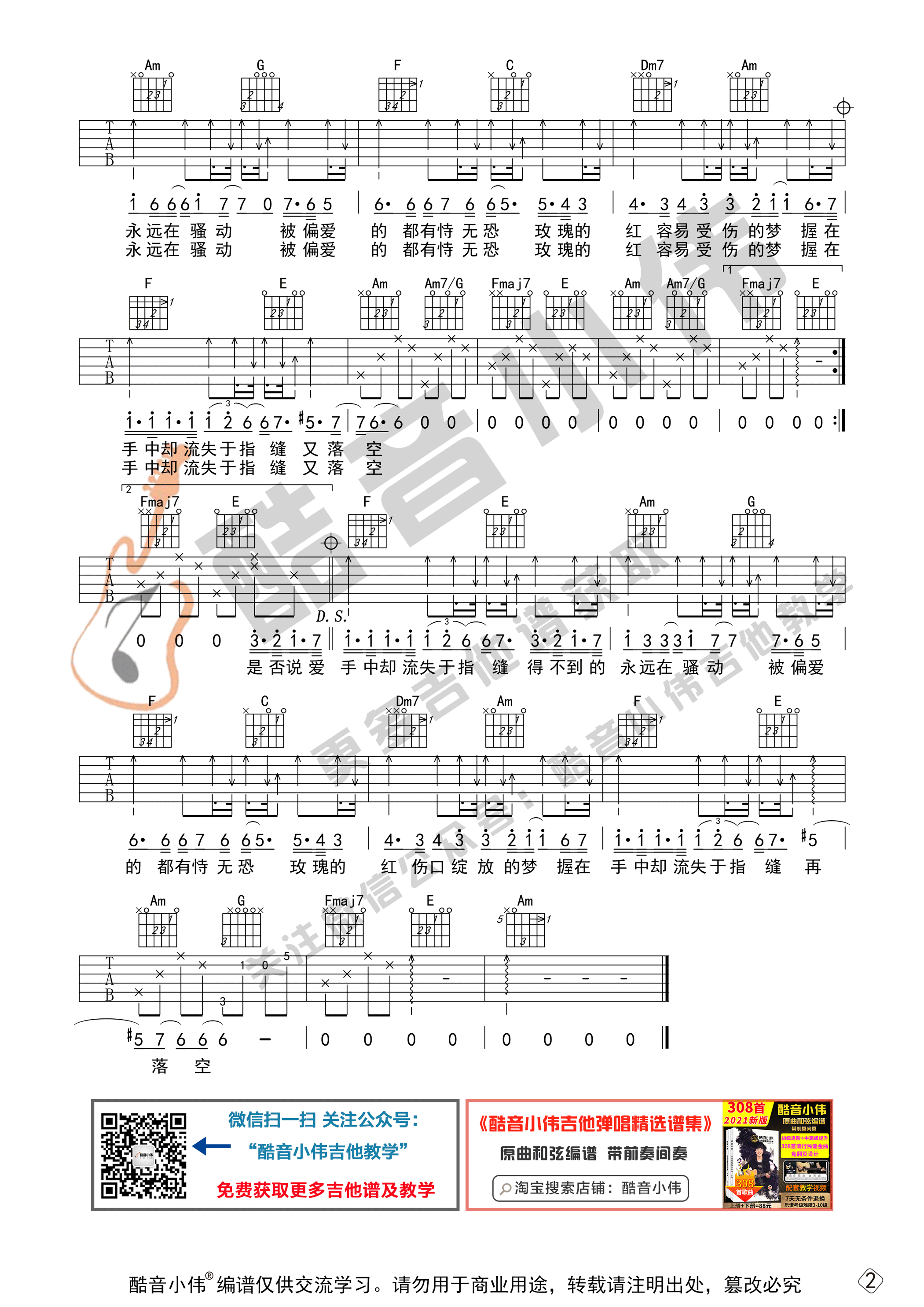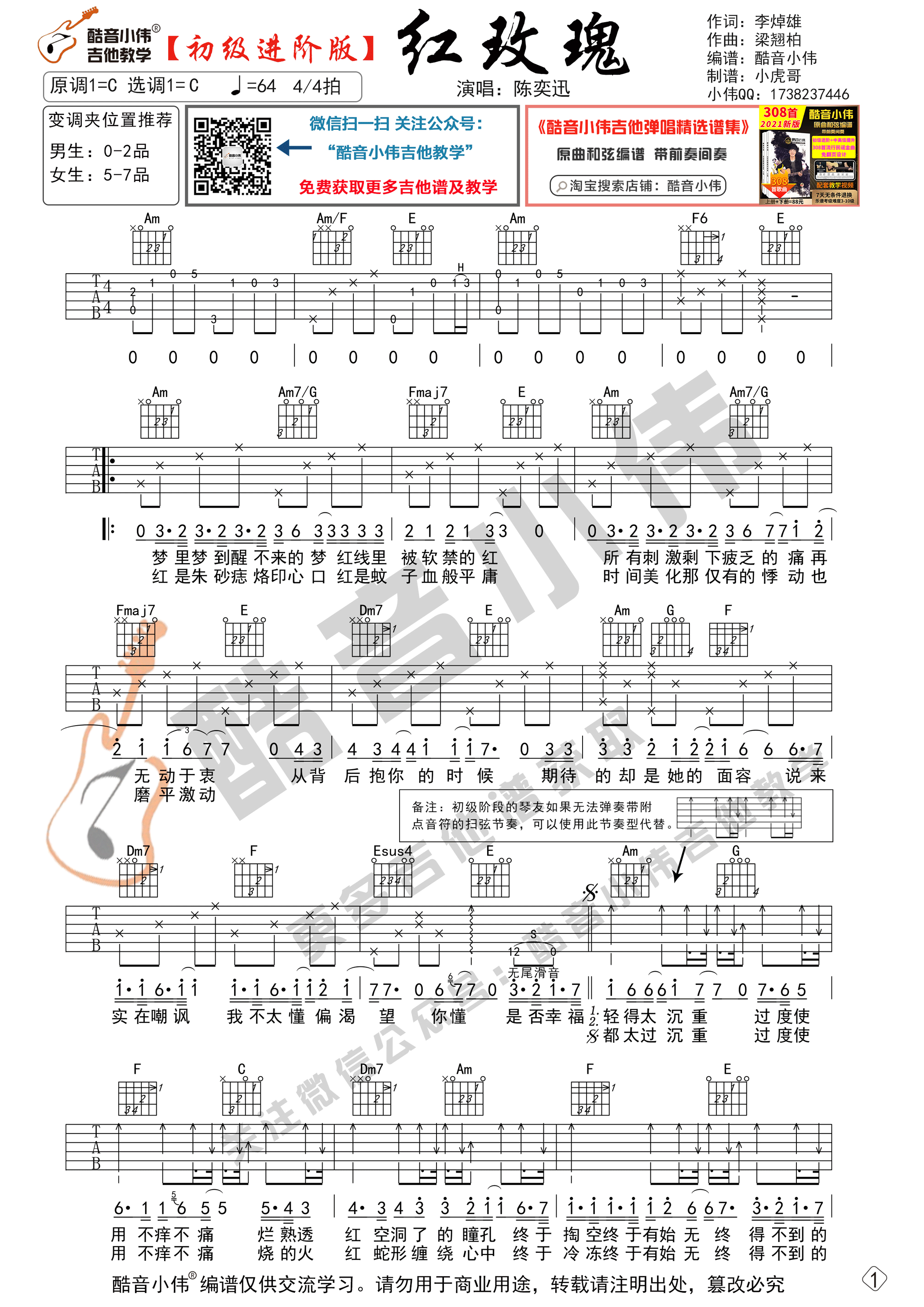 曲谱介绍: 曲谱适合有一定基础的琴友弹奏,选用C调指法编谱,变调夹的位子可以根据我的推荐来选择。使用了分解和带附点扫弦的节奏型,练习帮助提升水平,先弹奏会曲谱,再清唱会,然后弹唱结合一起练习。《红玫瑰》吉他谱采用了C调指法,由酷音小伟吉他做谱完成。