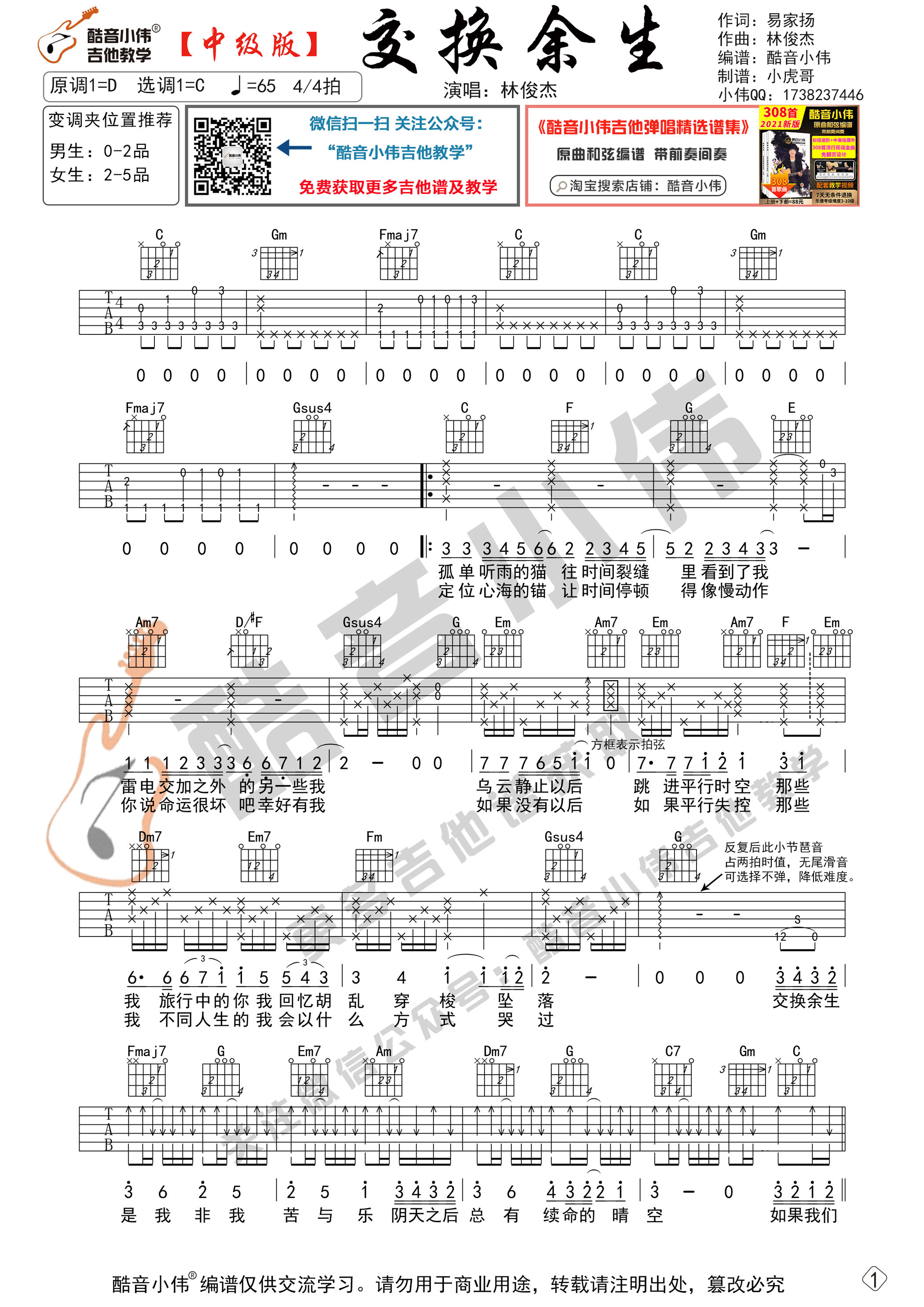 曲谱介绍: 曲谱适合有一定基础的琴友弹奏,选用C调指法编谱,变调夹的位子可以根据我的推荐来选择。编谱带前奏尾奏,练习帮助提升水平,先弹奏会曲谱,再清唱会,然后弹唱结合一起练习。《交换余生》是林俊杰演唱的歌曲,歌曲以情感层面出发,林俊杰充满情感激昂的旋律搭上易家扬的文字,让人跟着进入另一个时空。随即而来的弦乐开启了另一段并行故事,伴随着优美之中带着哀戚的音乐,让听众跟随一起反思人生。