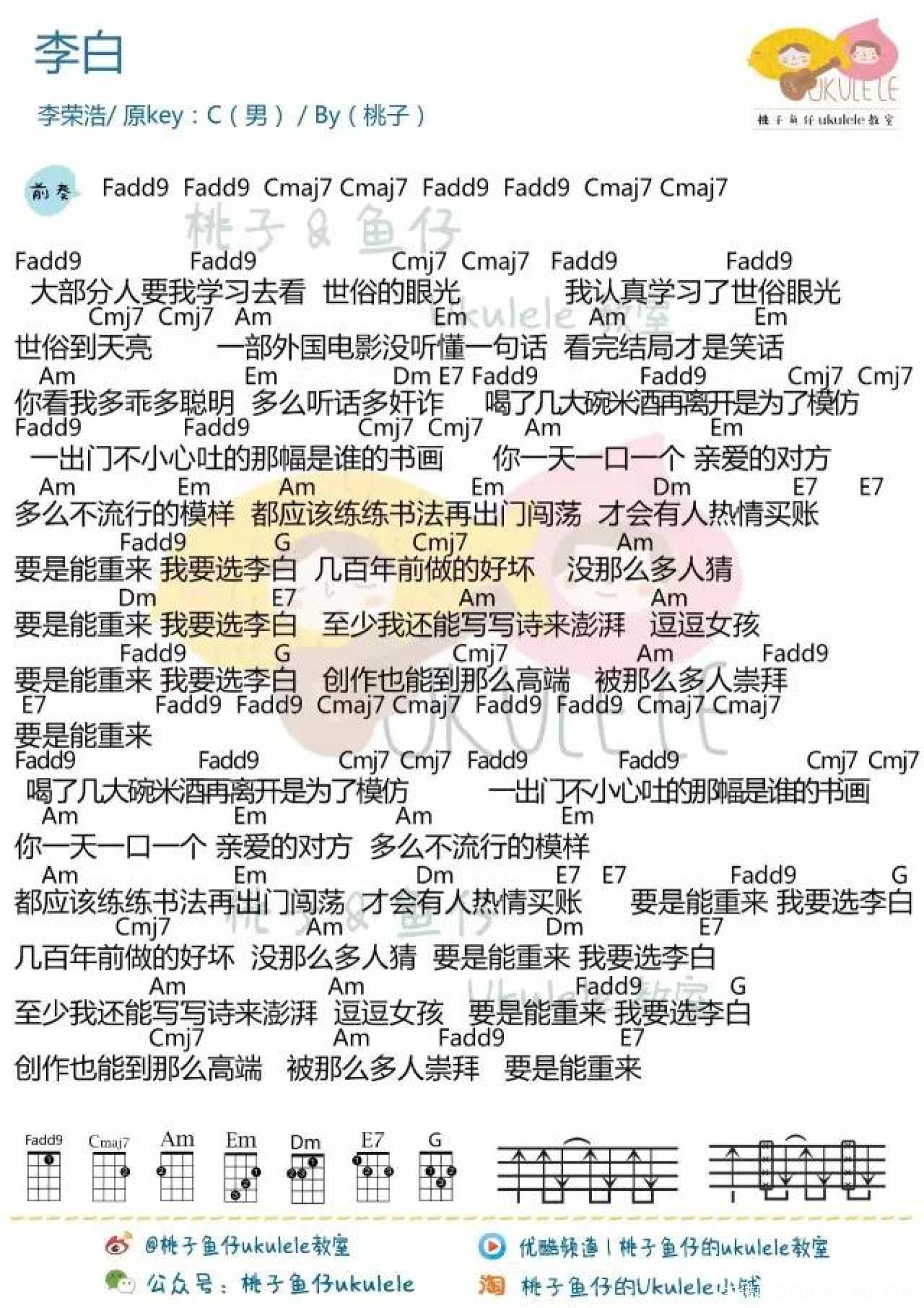 曲谱介绍: 李荣浩《李白》_C调尤克里里谱_男生版