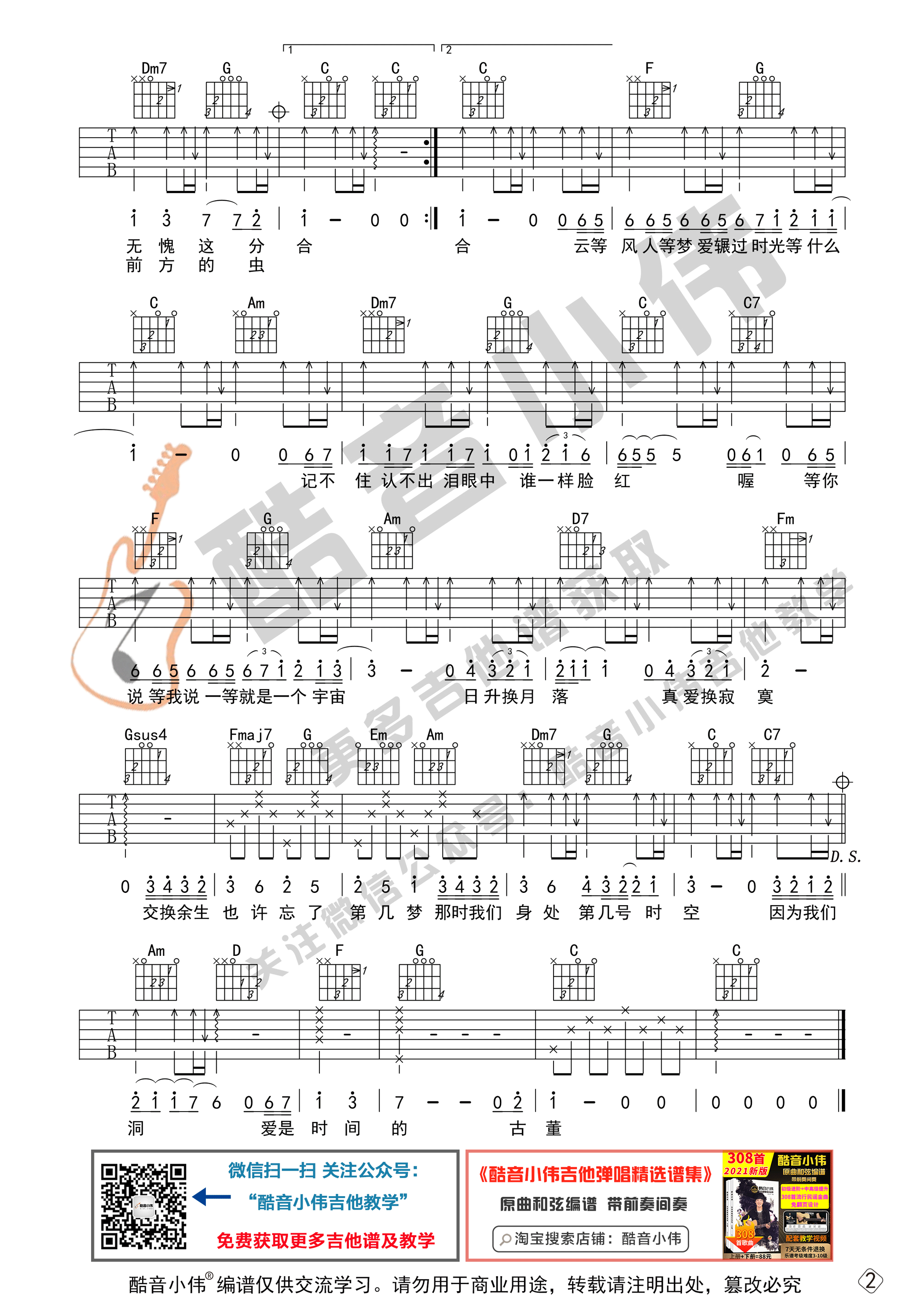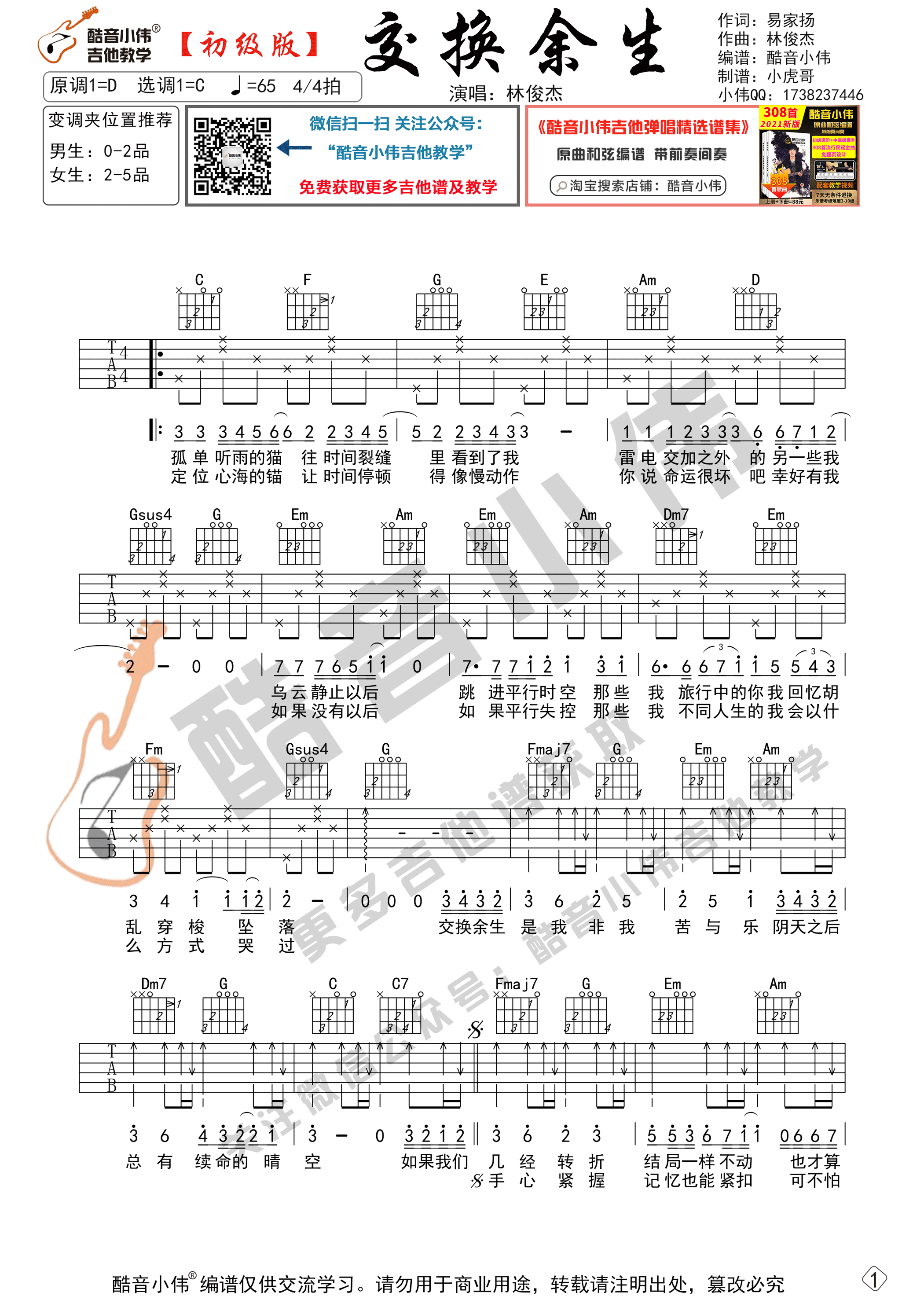 曲谱介绍: 曲谱适合初学者练习,选用C调指法,变调夹的位子可以根据我的推荐来选择。使用八分音符分解伴奏型,先弹奏会曲谱,再清唱会,然后弹唱结合一起练习。《交换余生》是林俊杰演唱的歌曲,歌曲曲的整体风格旋律婉转柔美,情绪起伏逐步递进。“交换余生,是我,非我,苦与乐,阴天之后总有续命的晴空。如果我们几经转折,结局一样不动,也才算无愧这分合”的歌词充满着宿命感的羁绊。