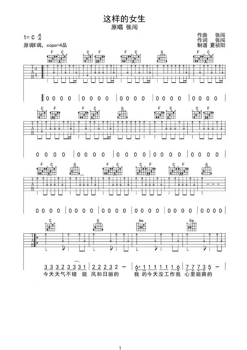 曲谱介绍: 张闯《这样的女生》吉他弹唱谱,采用C调指法编配,夏祯阳编配出品,共有5张高清图谱。