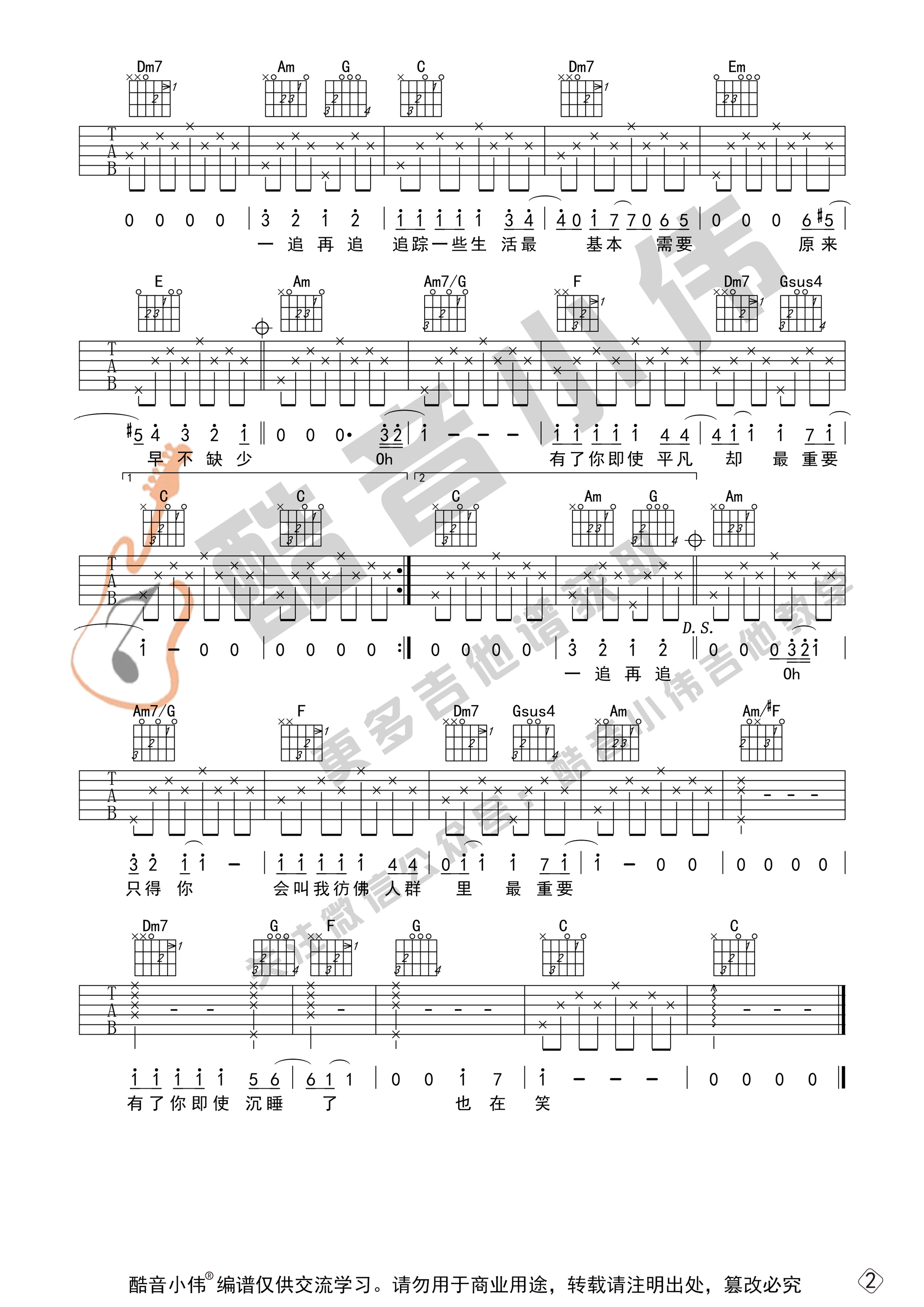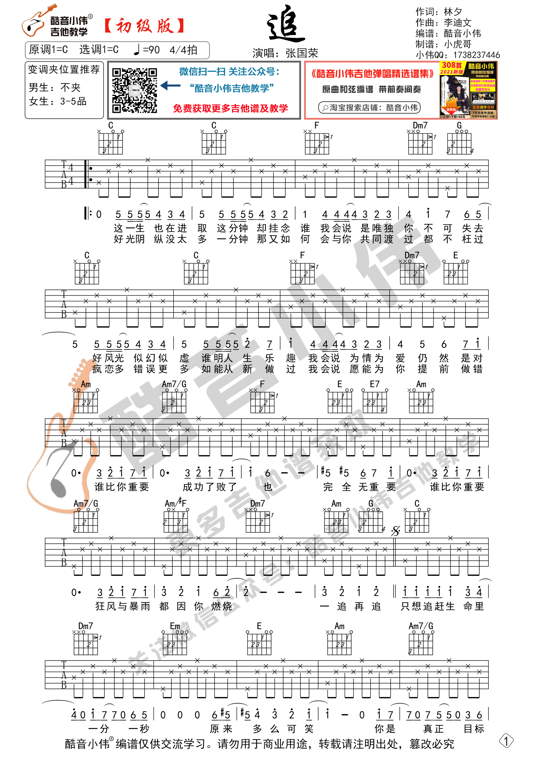 曲谱介绍: 曲谱适合初学者练习,选用C调指法,变调夹的位子可以根据我的推荐来选择。使用八分音符分解伴奏型,先弹奏会曲谱,再清唱会,然后弹唱结合一起练习。《追》是由张国荣演唱的歌曲,是1994年陈可辛执导的电影《金枝玉叶》的插曲。在这首歌曲中张国荣唱穿越了生活,变成永恒游走在时空里的声音。声音和感情饱满且收放自如,“追”时放,“笑”时收。