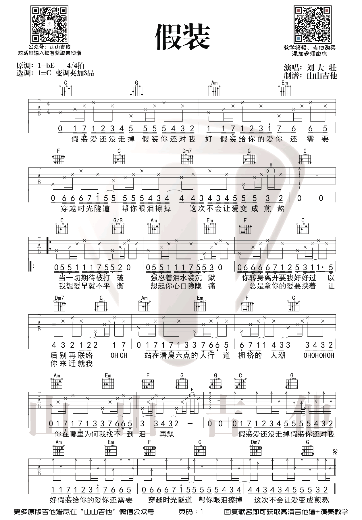 曲谱介绍: 《假装》吉他谱采用了G调指法编谱,G调和旋,变调夹加3品。由超星男孩作词、作曲,歌手刘大壮演唱,发行于2021年6月3日。其实所有纠结于过去的人心里早就有了答案只是因为我喜欢去假装,才和你渐行渐远。回忆,感觉相加在—起假装TA还在身边,假装—切都能回到原点2021年的初夏,假装你还没走掉,假装你还对我好。刘大壮携全新单曲《假装》,去释怀那个TA出现的夏天。