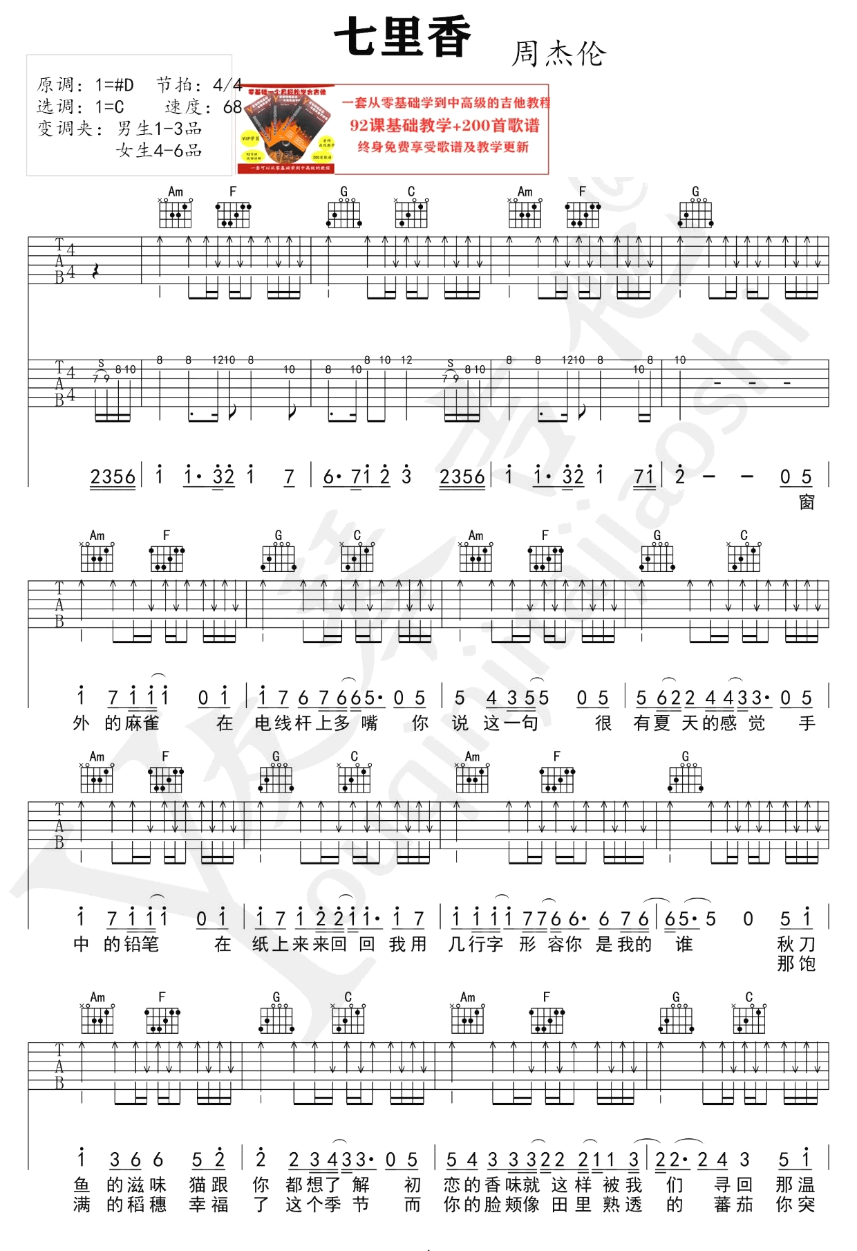 七里香吉他谱 - 周杰伦 - C调吉他弹唱谱