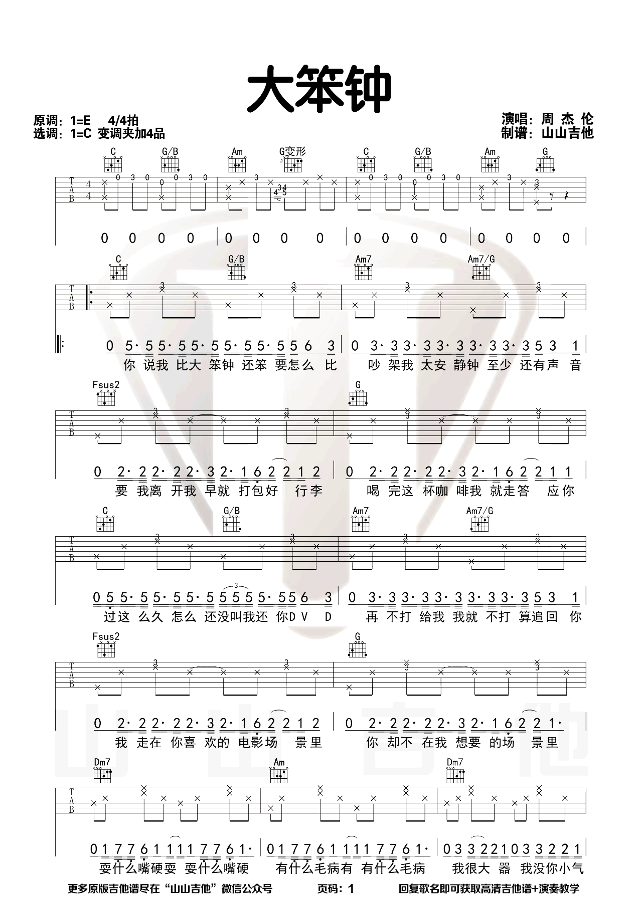 曲谱介绍: 《大笨钟》吉他谱,原调E选调C,变调夹夹四品。由周杰伦作词、作曲,黄雨勋、梦想之翼编曲,发行于2012年12月28日。这首歌曲所属发行的专辑《十二新作》中。《大笨钟》这首歌取自英国大本钟,但是这首歌内容却完全跟大本钟没有半毛线关系。明显是周杰伦在英国玩的时候,突发灵感以“大、笨、钟”这三个关键字玩的一个音乐梗。