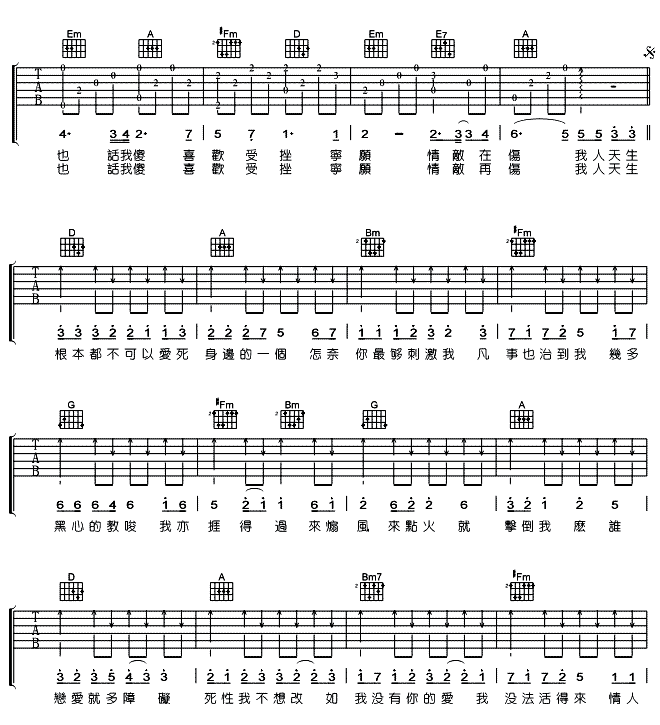 曲谱介绍: 死性不改吉他谱采用了D调指法,这首歌曲深受喜爱。《死性不改》这首歌曲由黄敬佩填词,张佳添作曲,可称得上是香港两大人气组合twins和boy'z的代表曲目,这首歌曲最初发行于boy'z的音乐专辑《一起喝彩》当中。《死性不改》这首粤语歌曲讲述的是一对恋人分手时的告白,虽然依依不舍,但是周围人都不希望他们在一起,他自己是真心喜欢着她,但她给了他太多伤害,最后还是固执己见死性不改地决定告别这段恋情的故事,让人心痛。重要提示:亲情吉他谱更新啦,学完这首后,顺便把下首学了吧。