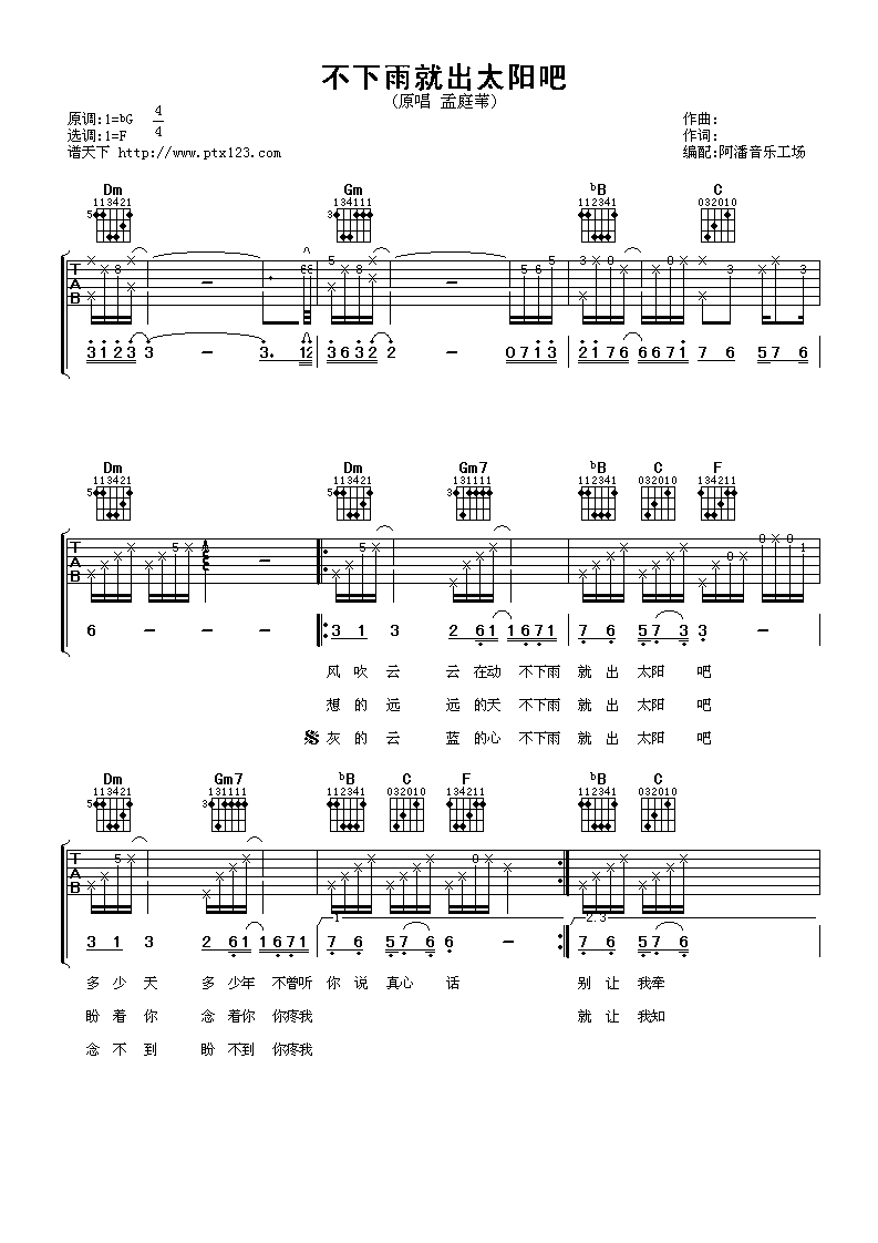 曲谱介绍: 不下雨就出太阳吧吉他谱采用了F调指法,由阿潘音乐工场编配完成。这是一首十分经典的老歌曲,受到了很多人的支持和喜爱,孟庭苇的歌声可以穿透人的心灵,有一种十分迷人的力量,空灵的天籁之音,无人能及,她的忧郁眼神写满诉说不完的故事,她的歌声永远定格在最美的年华,值得我们永远珍藏。不下雨就出太阳吧,这首歌曲让我们感受到了一种被阳光包围的温暖,很是舒服。听兄弟说,鸟之诗吉他谱听了耳朵会怀孕,快快学起来,学完去撩妹!