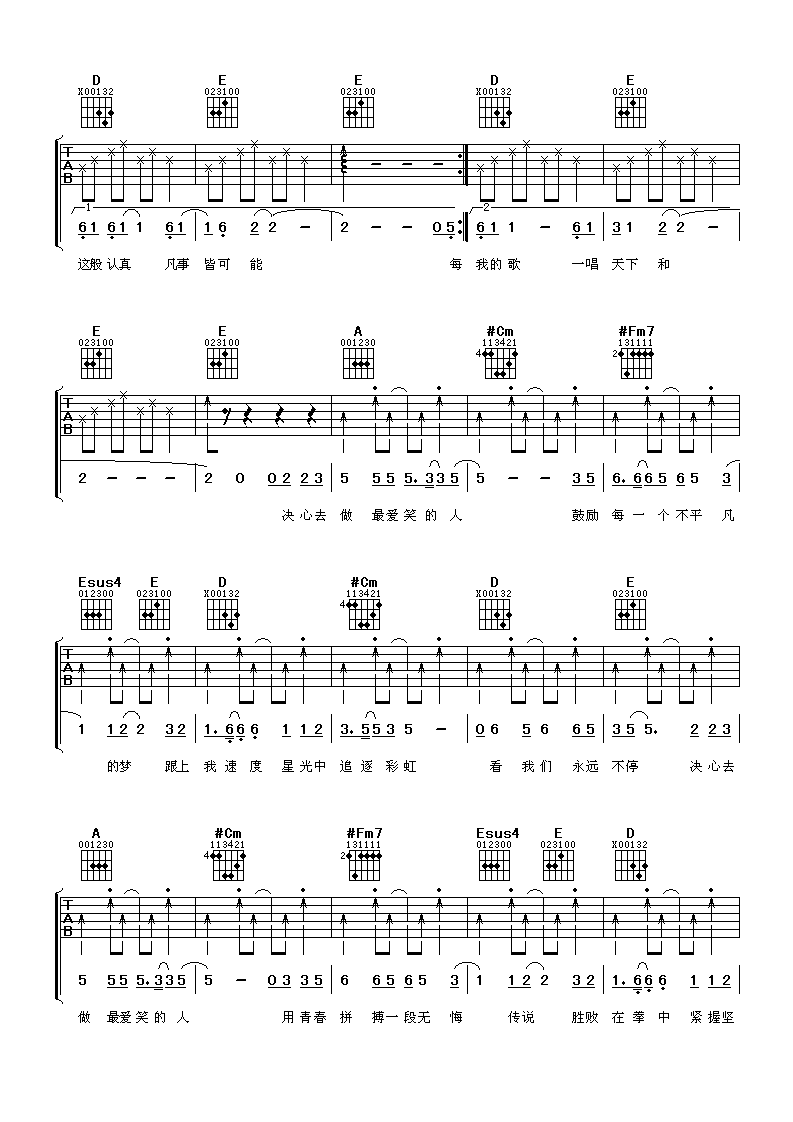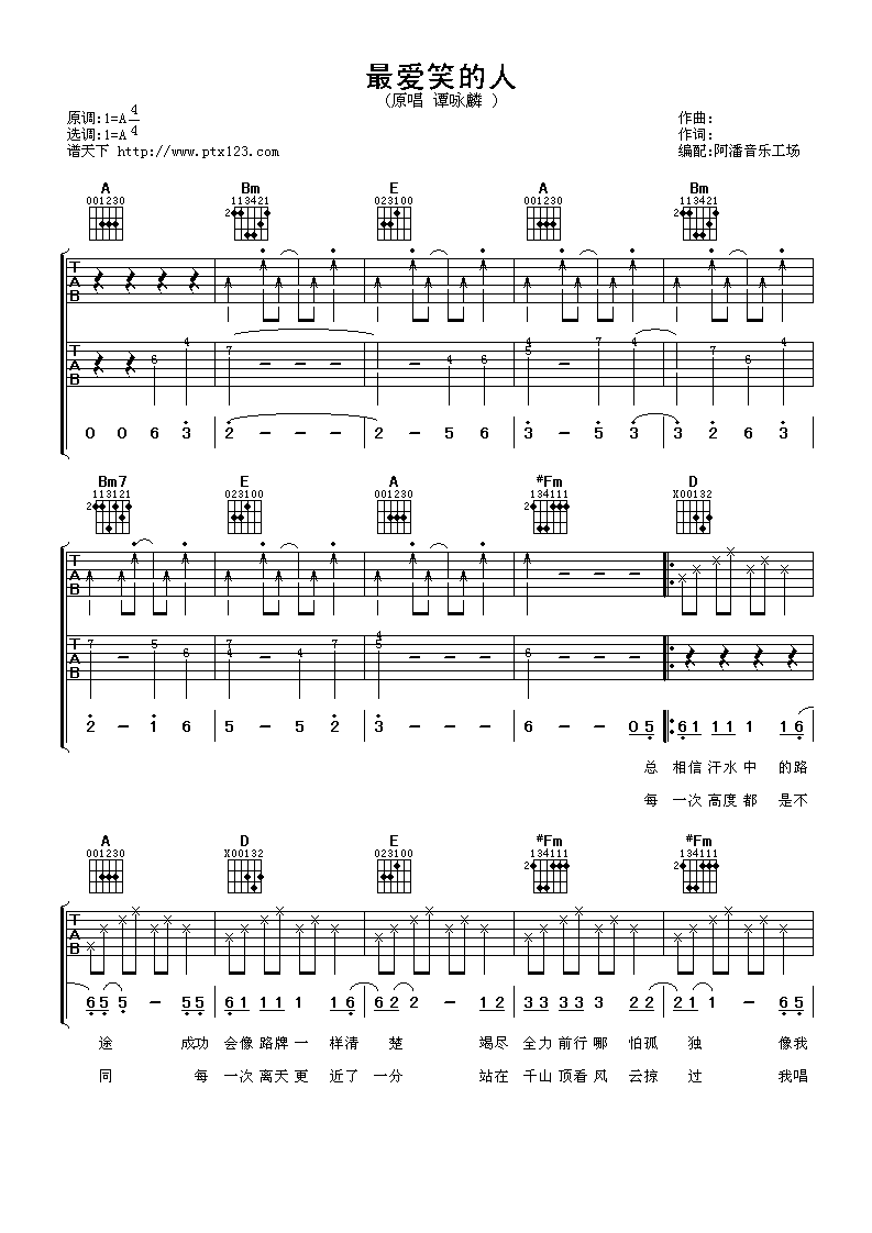 曲谱介绍: 最爱笑的人吉他谱采用了A调指法,由阿潘音乐工场编配。《最爱笑的人》是一首励志歌曲,给我们带来了满满的正能量,因此,很多人十分喜欢这一首歌曲。除了这首谱以外,樱花树下吉他谱也非常不错,速度去围观一下吧!