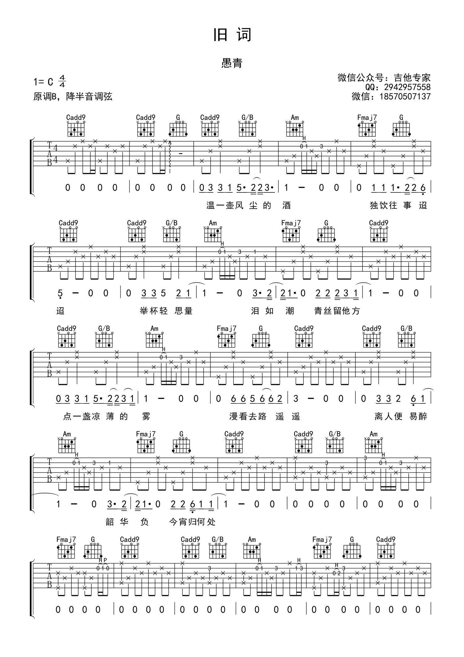 曲谱介绍: 愚青《旧词》吉他谱,原调B,降半音调弦,选用C调指法编配。愚青《青鸟与诗》专辑收录, 或是我们终究做不了路途的归人,当我们需要答案的时候,与其茫茫然上路,不如回到最初的地方。此刻凉薄的他乡,不如等我归家的烛光。饮罢这杯风尘的酒,天亮启程回到将我视为归人的故乡。