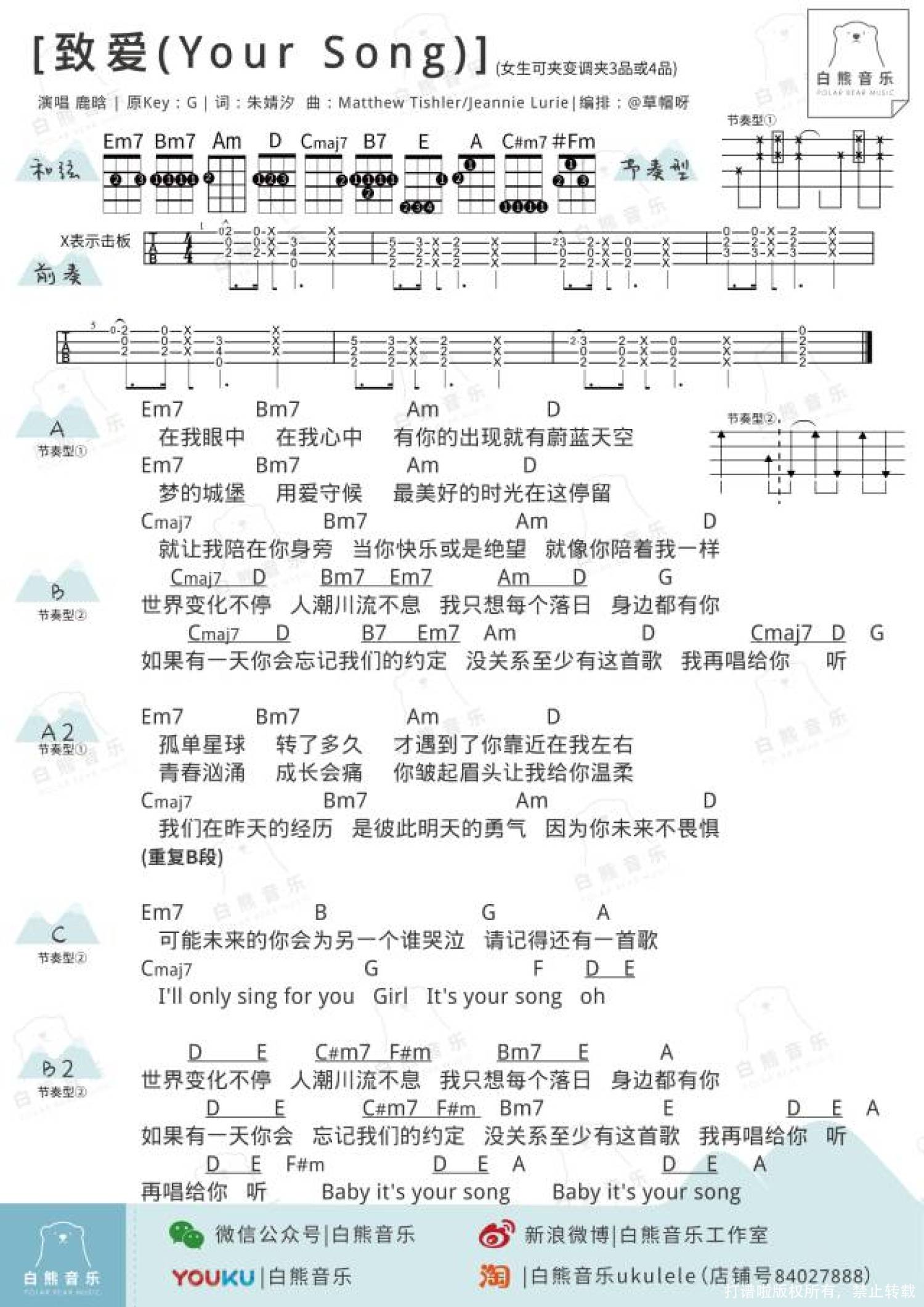 曲谱介绍: 鹿晗《致爱》_G调尤克里里谱