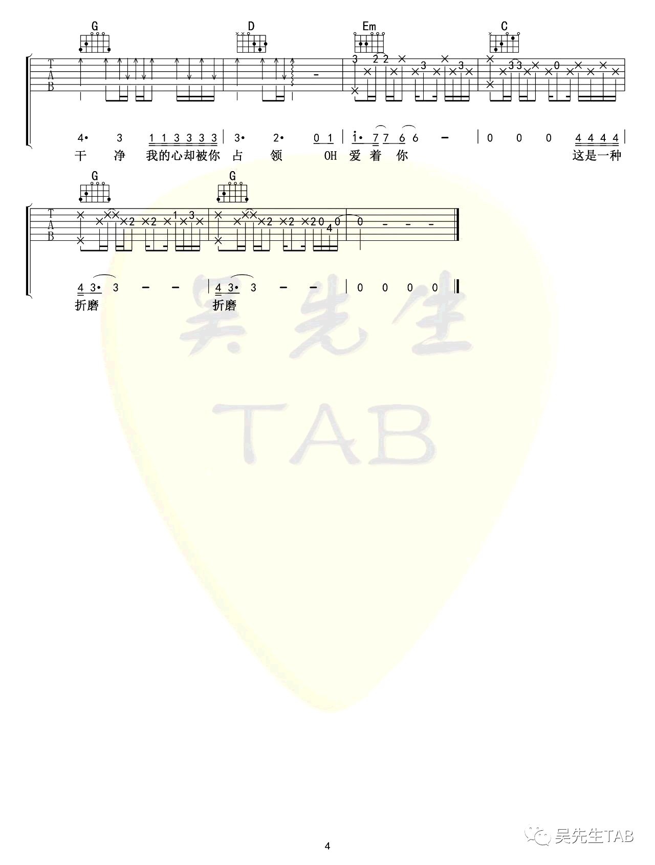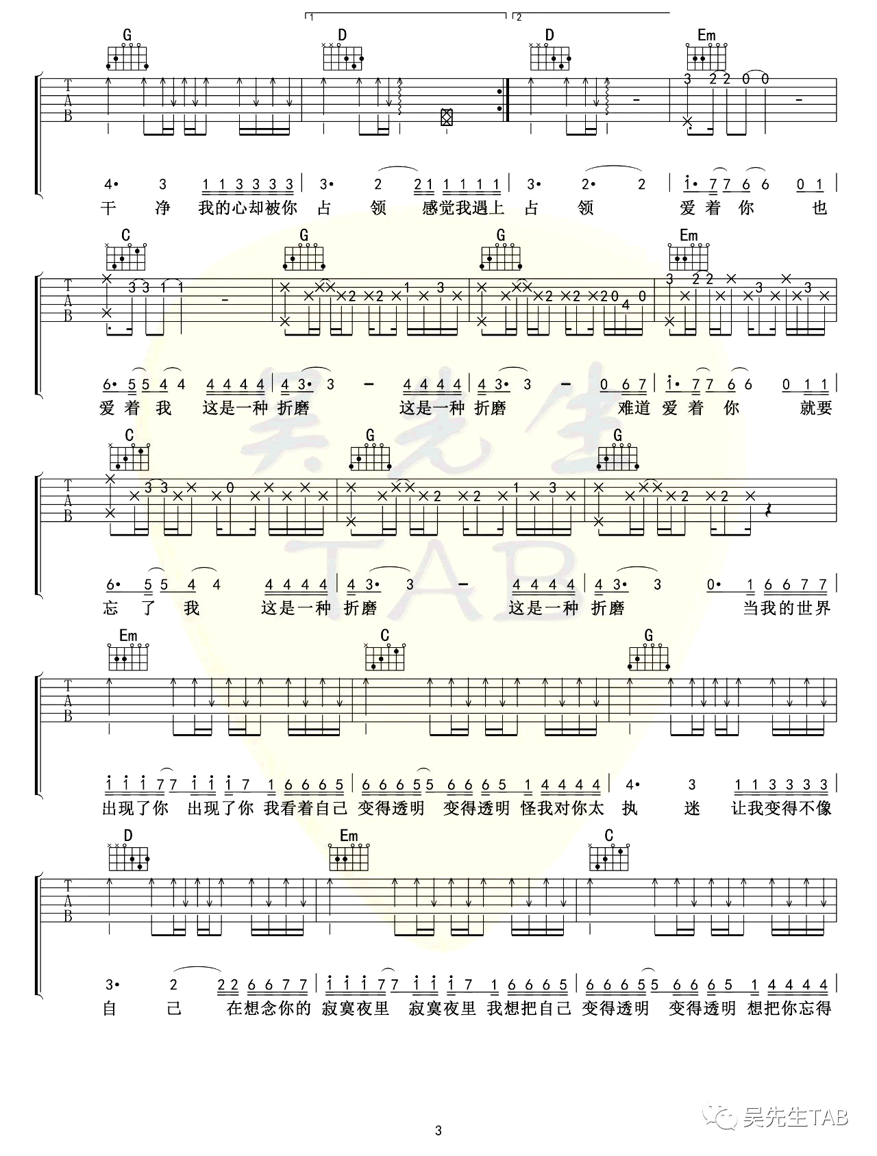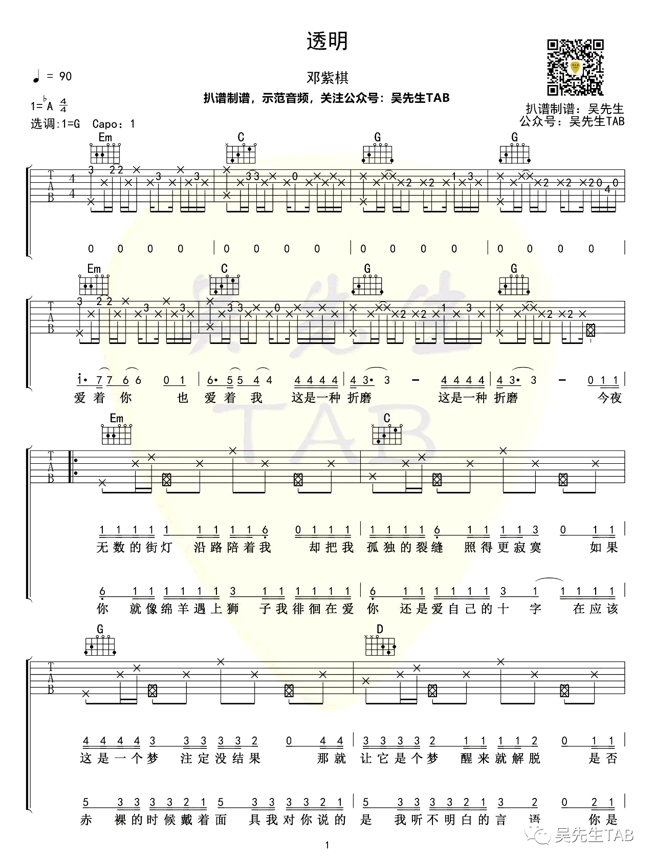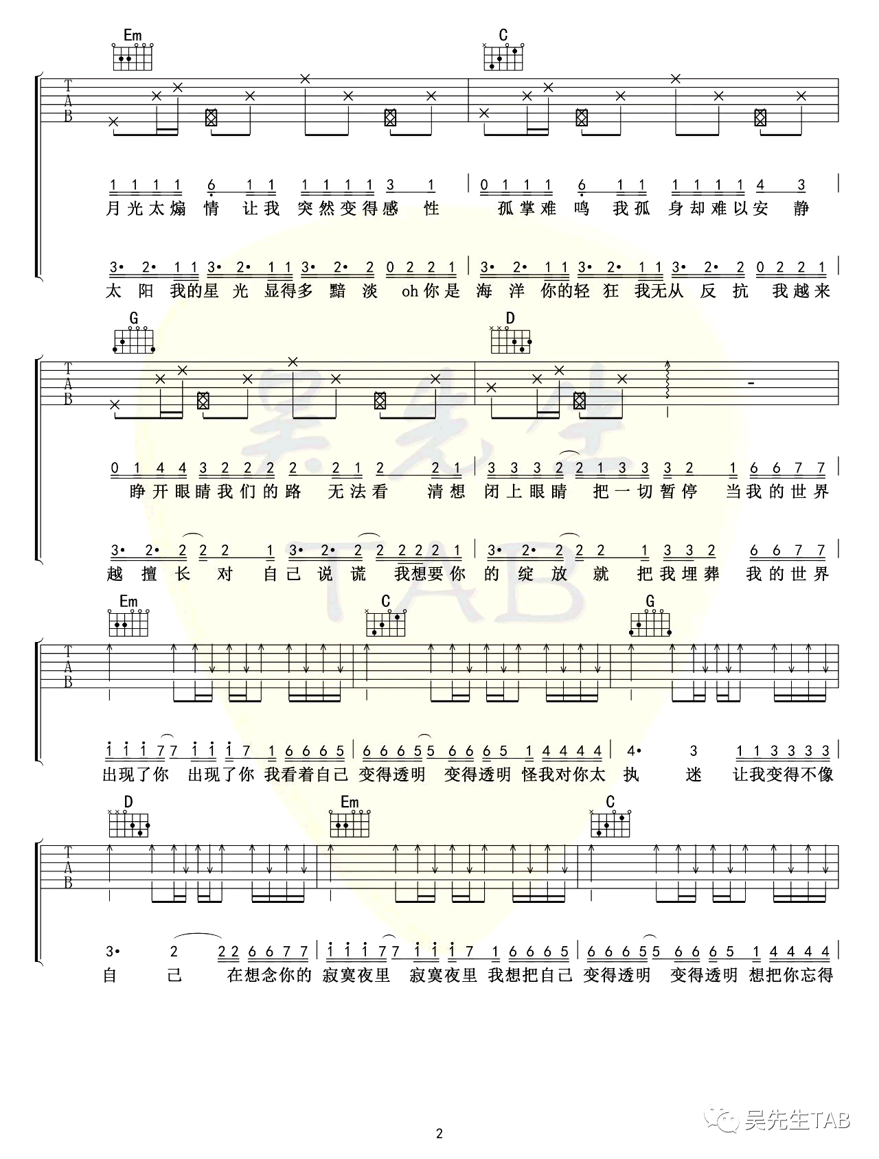 曲谱介绍: 透明吉他谱采用了A调指法,由吴先生编配完成。邓紫棋《透明》的这首歌曲讲述在一个人如果爱情中失去自我,就像变色龙失去了色彩变得透明。除了这首谱以外,为你写诗吉他谱也非常不错,速度去围观一下吧!