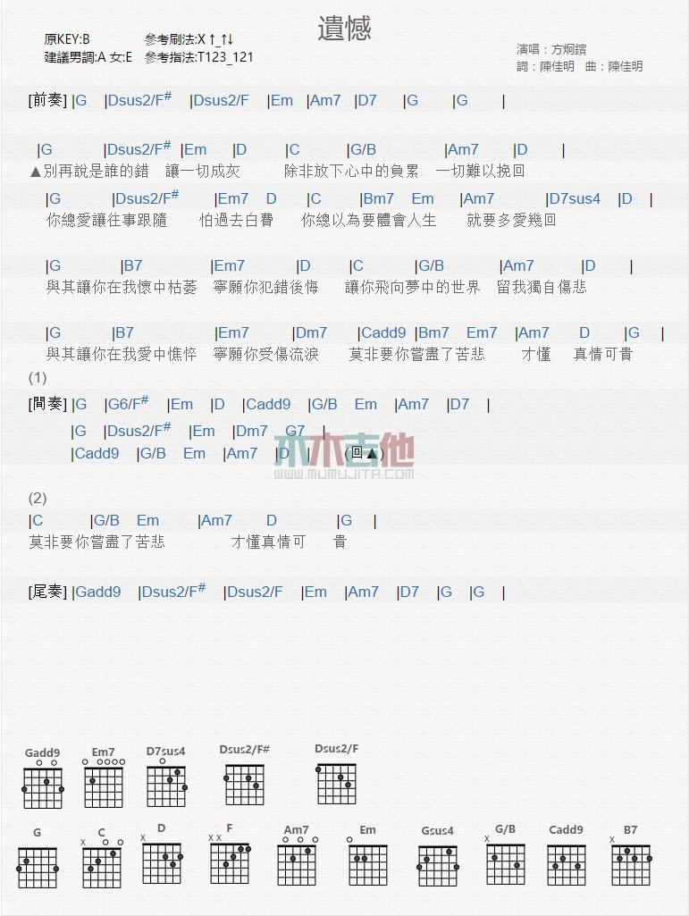 曲谱介绍: 遗憾《遗憾_》吉他弹唱谱,共有1张高清图谱,免翻页排版设计。