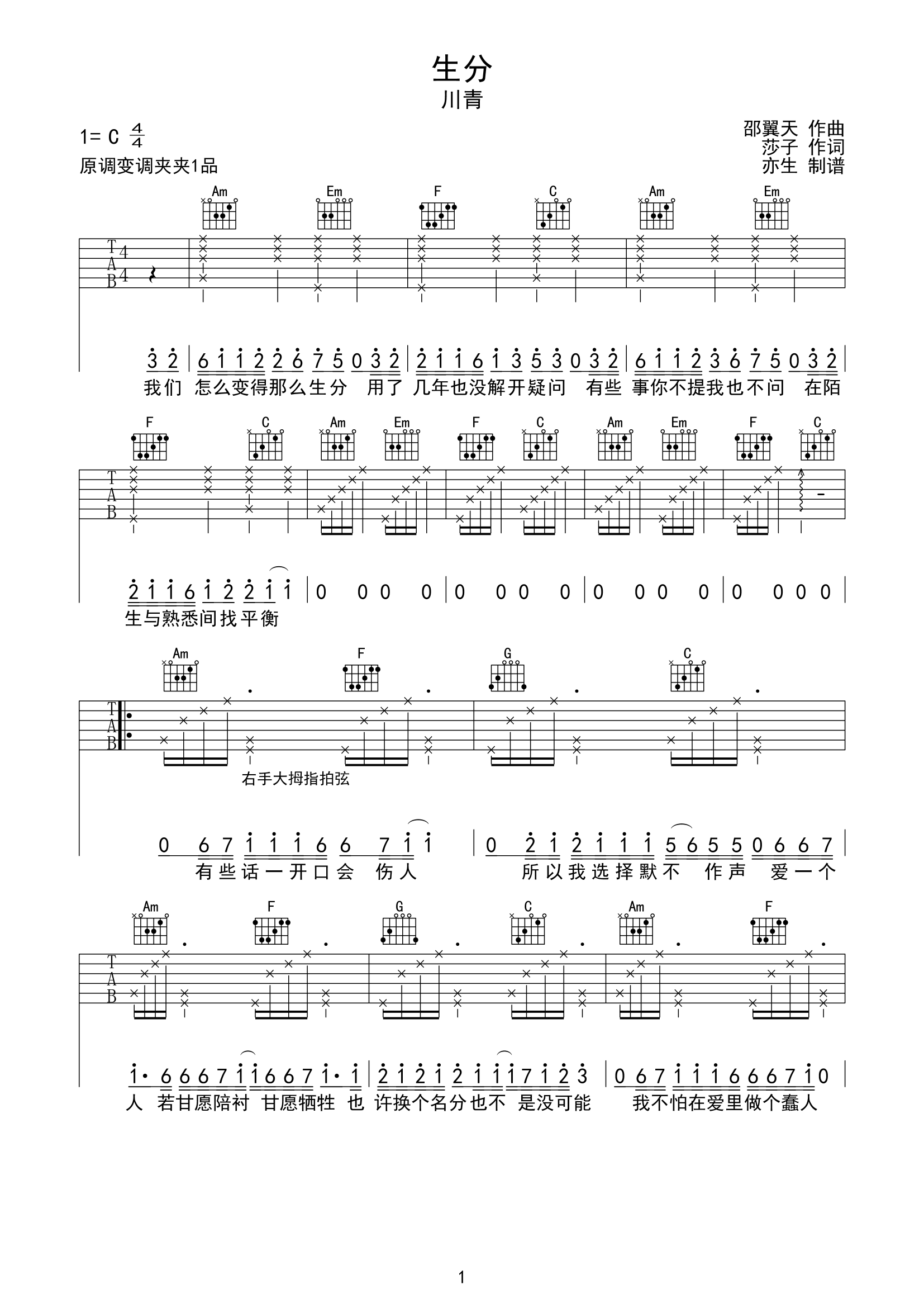 曲谱介绍: 生分吉他谱,川青演唱的一首非常好听的歌曲,《生分》吉他弹唱谱,采用了C调指法编配,变调夹夹第一品演奏,节奏4/4拍,速度控制在每分钟95拍左右,演奏难度简单。