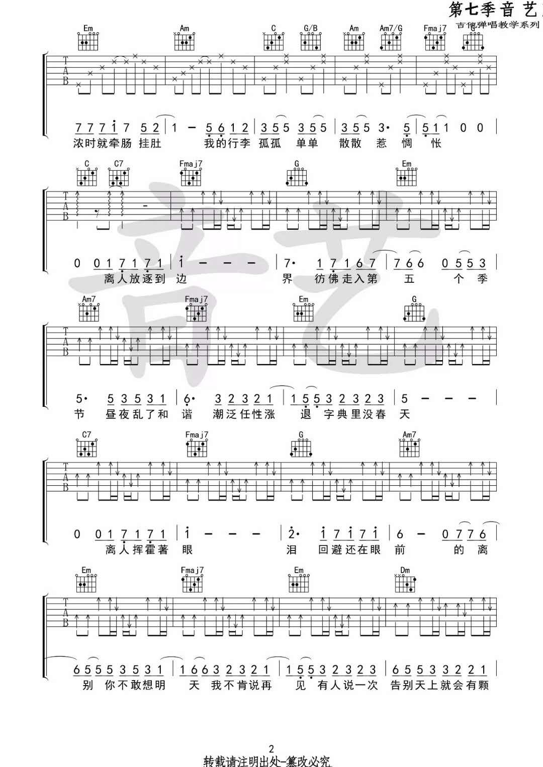 曲谱介绍: 离人吉他谱是天王张学友的一首经典歌曲。变调夹夹三品选用C调指法,歌手美丽动听,空明流动的音符,追忆离人。唱出了内心的伤感,加上张学友那磁性的声音,听来使人心境如水。歌曲原调降E调,谱子采用C调指法编配。张学友用自己真挚的情感诠释了这首伤感爱情歌曲。这首歌曲也曾被林志炫翻唱过,最近这首歌曲是因为网络上的一个搞笑视频火了,喜欢的朋友弹奏试试哦,琴谱网编辑整。(共三个版本、C调 E调 D调)喜欢的朋友对比弹一下试试哦。