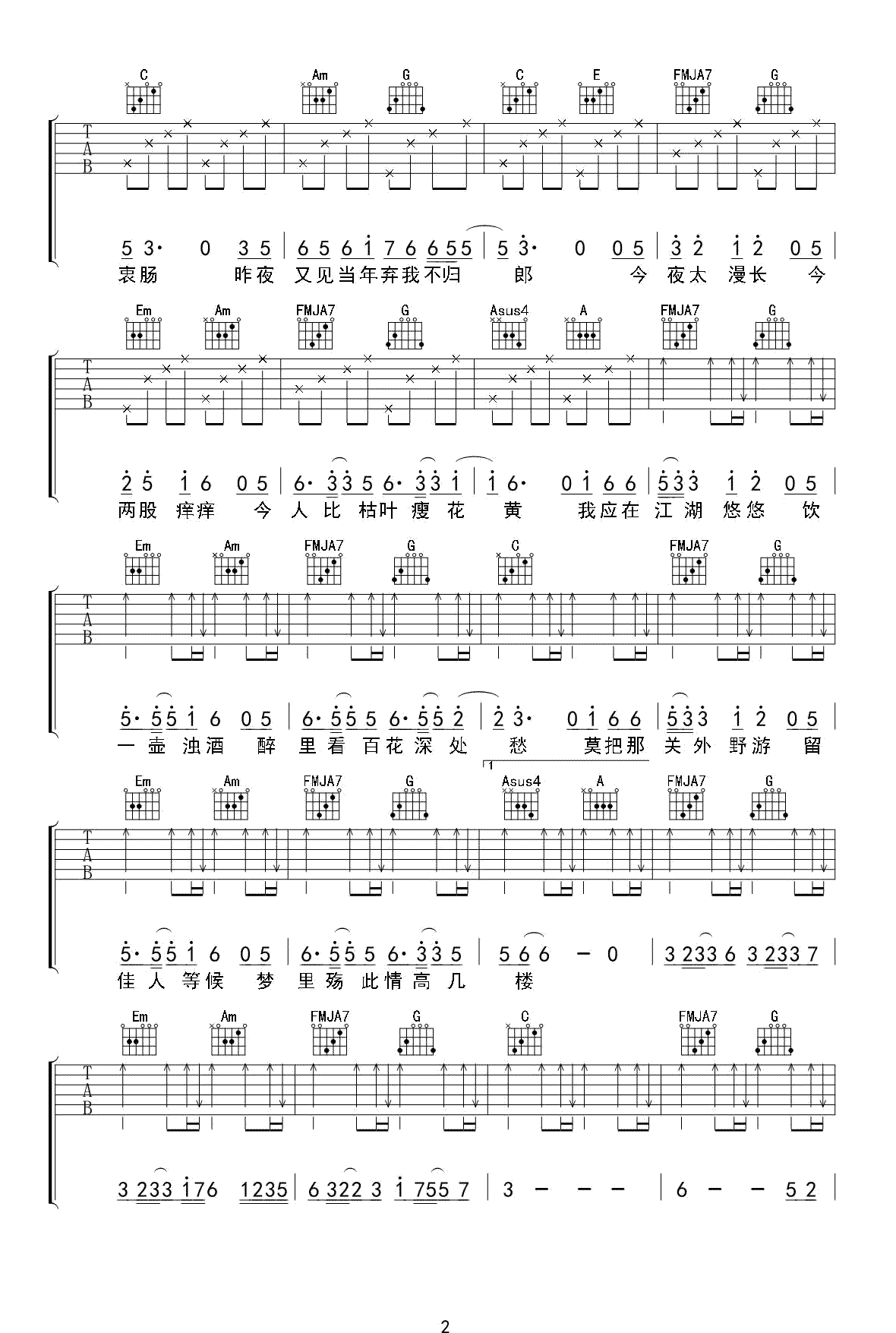 曲谱介绍: 离人愁吉他谱是根据歌手李袁杰演唱的歌曲编配的吉他谱。歌曲原调bE,吉他谱采用C调指法编配。弹奏的时候变调夹夹三品。 这首歌曲在网络上很火。歌词古典风格。讲述了爱恨离别的伤感故事。在江湖里饮酒,醉看白花深处愁。这首歌曲也融入了戏曲元素,唱腔中充满了戏曲风味。用柔美而又淡淡忧伤的歌词演绎了那个年代的爱情。离人指的是现在的失恋的人。古往今来爱情是永恒的话题。自古都有因爱而伤的故事。歌词写的很唯美“繁华落幕离人难敢诉衷肠,昨夜又见当年弃我不归郎,今夜太漫长,今两股痒痒,离人愁今人比枯叶瘦花黄”,离别的伤感让李袁杰唱的分外伤感,喜欢的朋友弹唱试试哦。本站更新了三个版本,另外还有小琪、梦马版。琴谱网编辑整理。