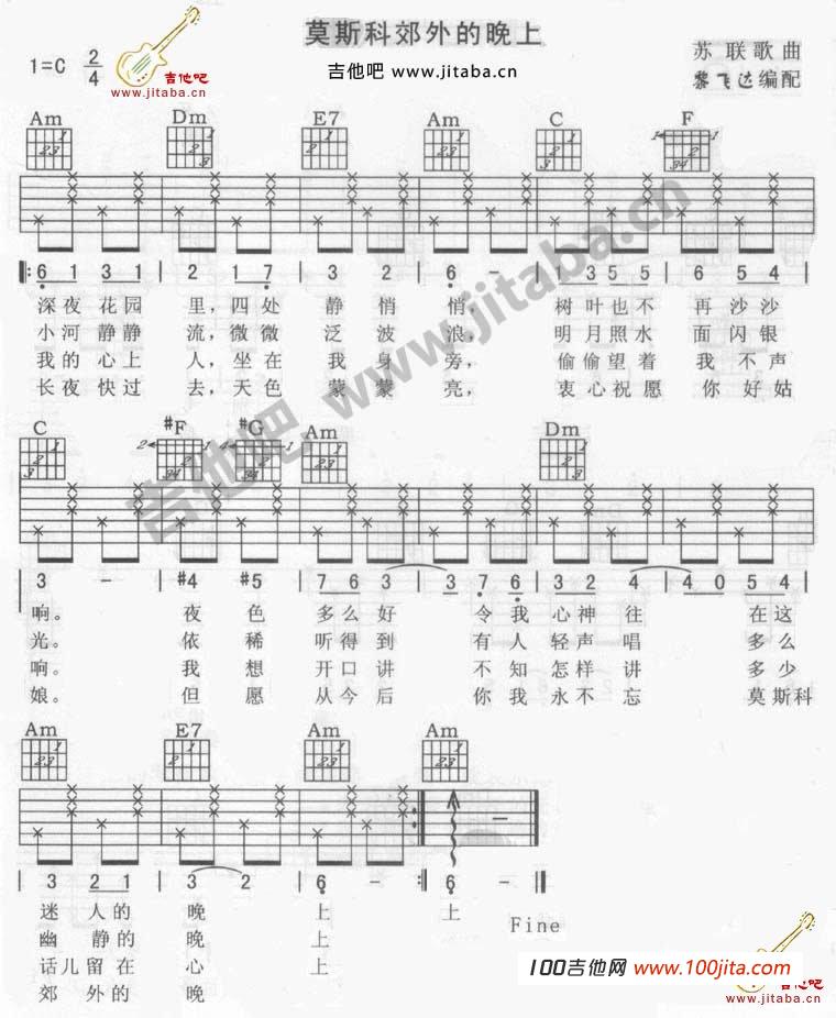 曲谱介绍: 莫斯科郊外的晚上吉他谱是根据著名苏联民歌编配的吉他谱。歌曲旋律悠扬宁静中充满了浪漫的气息,是不可多得的国外经典民歌。歌曲非常有历史,经久传唱不朽。版本也很多,此版本有C调版和黑鸭子两个版本。比较好听的歌曲,琴友们拿起吉他弹唱一下哦。琴谱网编辑整理。