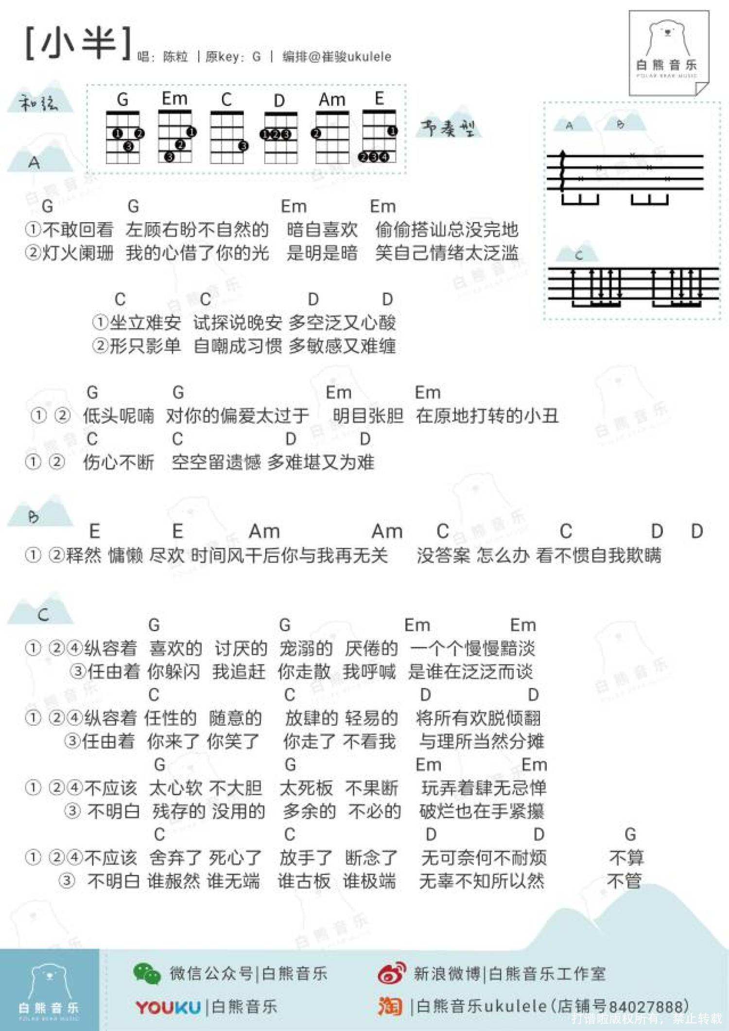 曲谱介绍: 陈粒《小半》_G调尤克里里谱