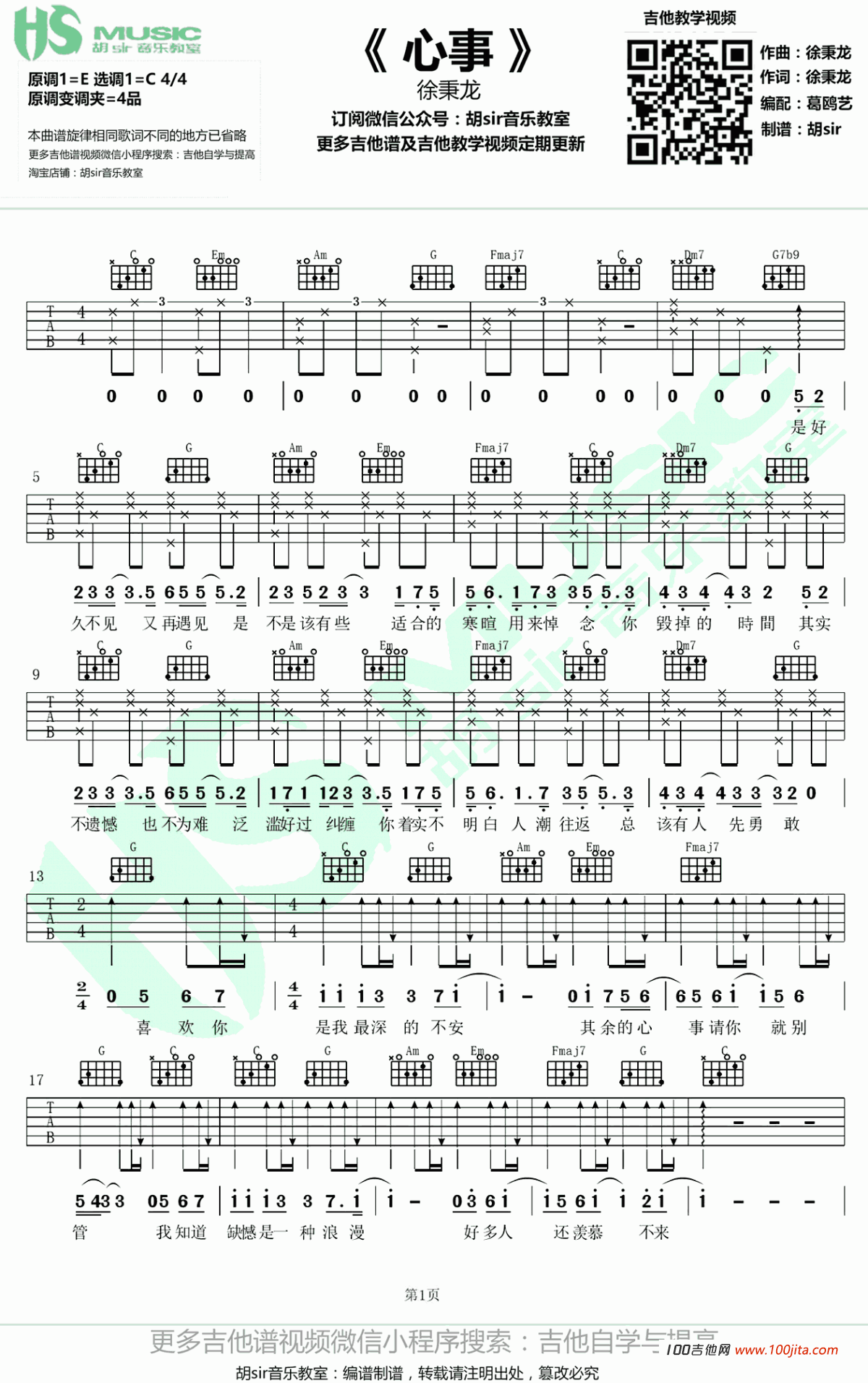 心事吉他谱 - 徐秉龙 - C调吉他弹唱谱