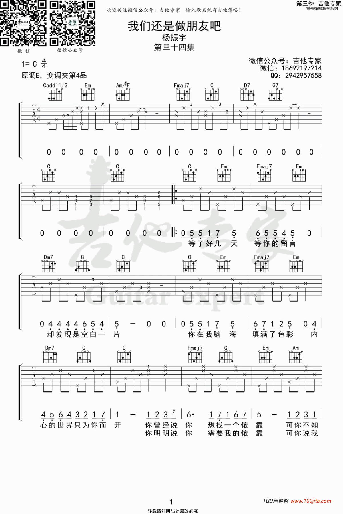 曲谱介绍: 我们还是做朋友吧吉他谱是根据一首经典的动漫歌曲编配的吉他谱。这首歌曲是杨振宇演唱的。《刺客伍六七之玄武国篇》是中国动漫的经典作品。故事情节曲折离奇,引人入胜。歌曲原调E调,谱子采用C调指法编配。变调夹夹四品。非常伤感的离别歌曲,歌词旋律虽然缓慢,但是却能把这种伤感的情绪输送到听众内心。曲子不错喜欢的朋友记得弹唱一下哦。琴谱网编辑整理。