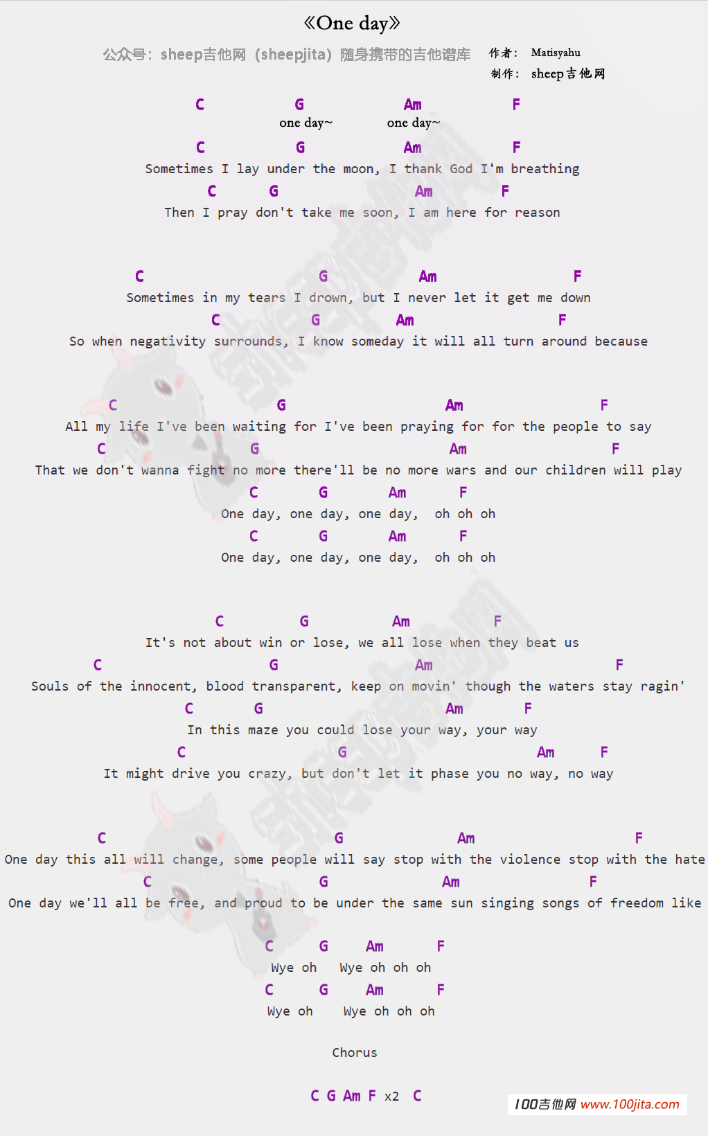 曲谱介绍: one day 吉他谱一首抖音最近很火的歌曲,这首歌曲最后经过多个翻唱版本,歌曲述所了战争的残酷,和对和平的渴望。喜欢这首英文歌曲的朋友弹唱一下哦。琴谱网编辑整理。