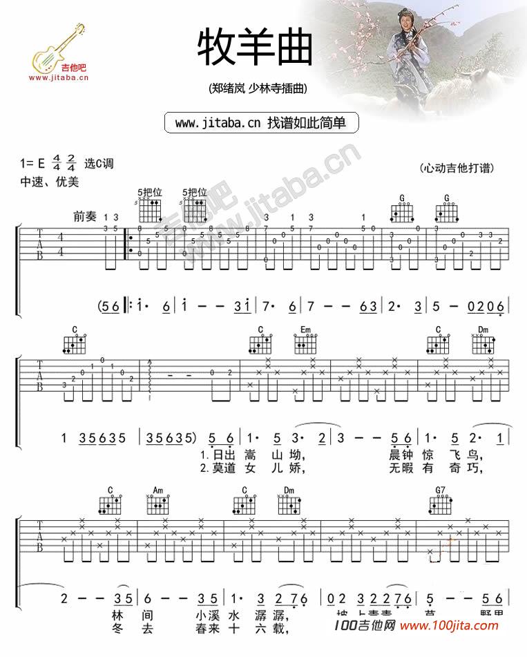 曲谱介绍: 牧羊曲吉他谱是根据电影《少林寺》的主题曲编配的吉他谱。歌曲原调E调,谱子采用C调指法编配。非常经典的影视老歌,少林的钢和曲子的柔搭配一体浑然天成。给人以刚柔并进的感觉。特别是那潺潺的流水,牧羊女和小和尚的画面是很多人不能忘却的。歌曲曲调清透委婉动听。具有强大的治愈力。喜欢这首歌曲的朋友不要错过的哦,可以说是比较适合吉他弹唱的经典老歌了。琴谱网编辑整理。