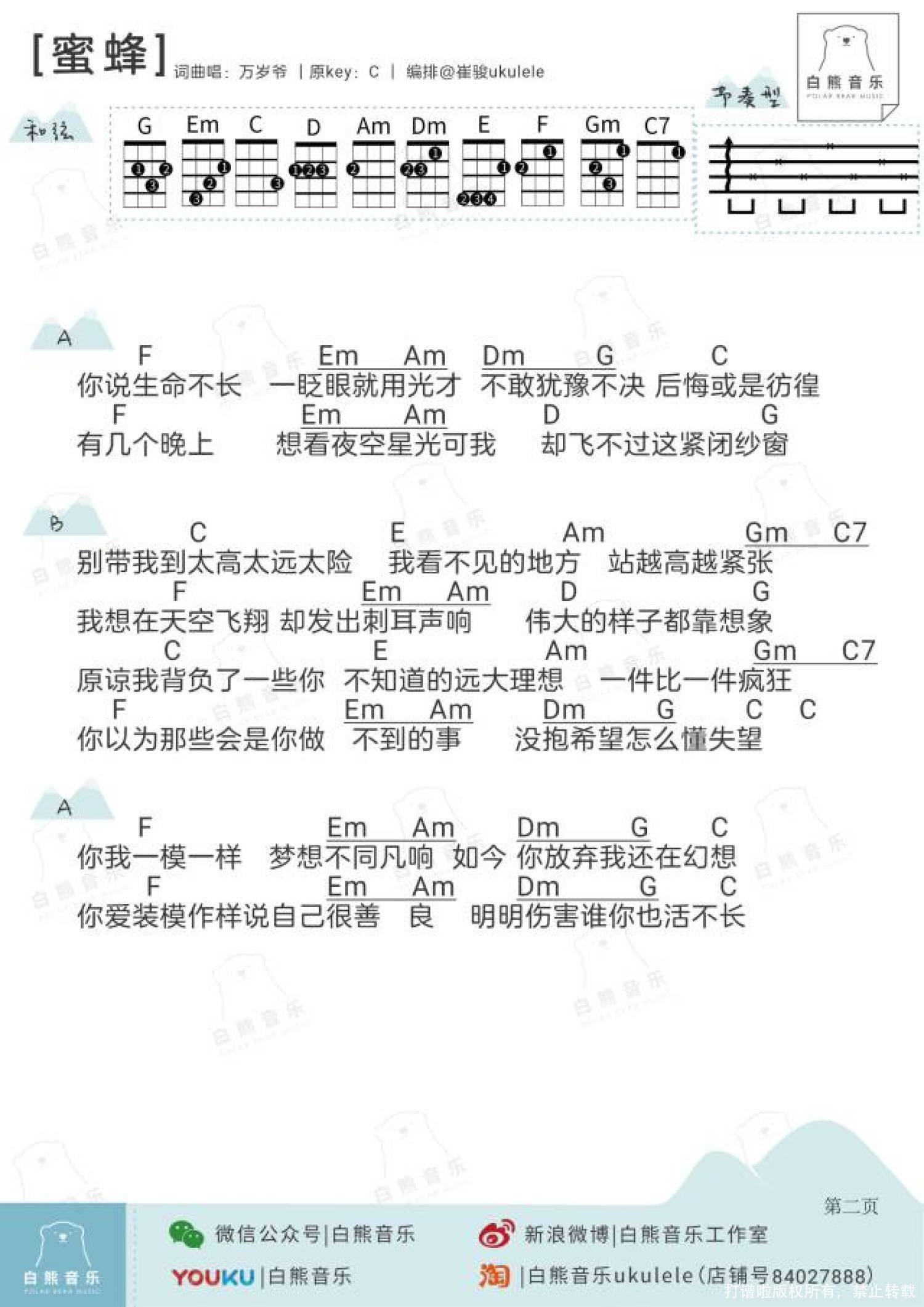 曲谱介绍: 万岁爷/万玲琳《蜜蜂》_C调尤克里里谱