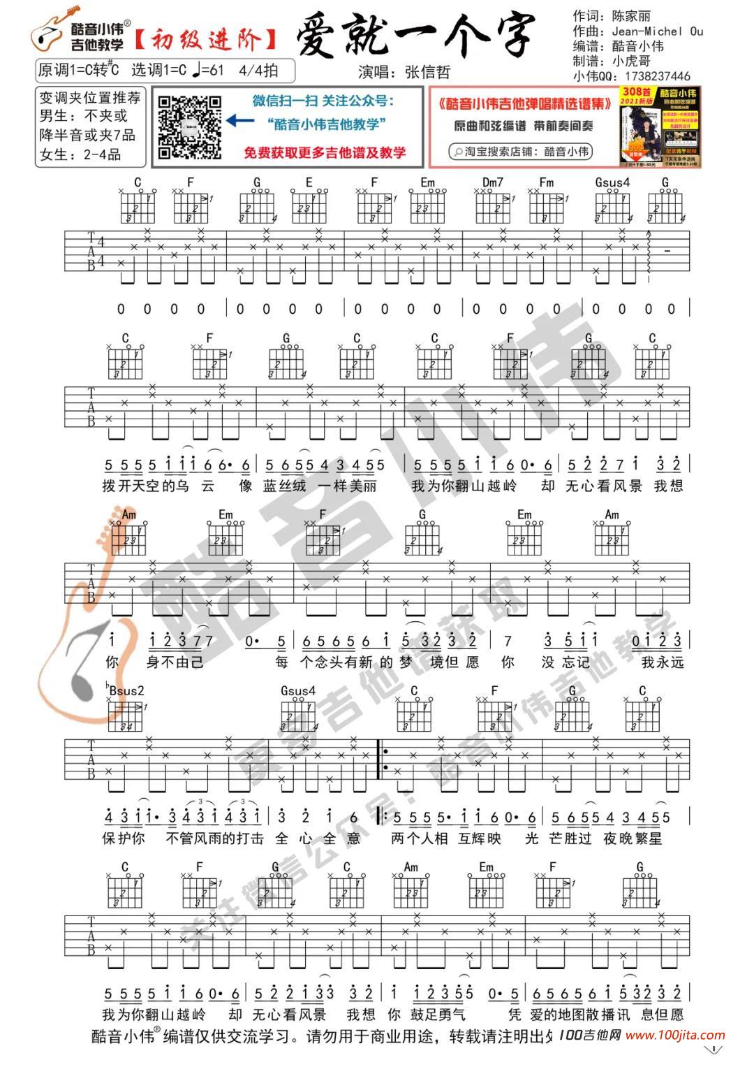 曲谱介绍: 爱就一个字吉他谱是根据歌手张信哲的一首经典歌曲编配的吉他谱。这首歌曲是成名曲一首经典老歌。谱子采用C调指法编配非常好弹的一首歌曲。这首歌曲也是国产动漫宝莲灯的片尾曲。喜欢这首情感的朋友弹唱一下哦。酷音小伟编配两个版本,初级版和中级版喜欢的朋友弹唱一下哦。琴谱网编辑整理。
