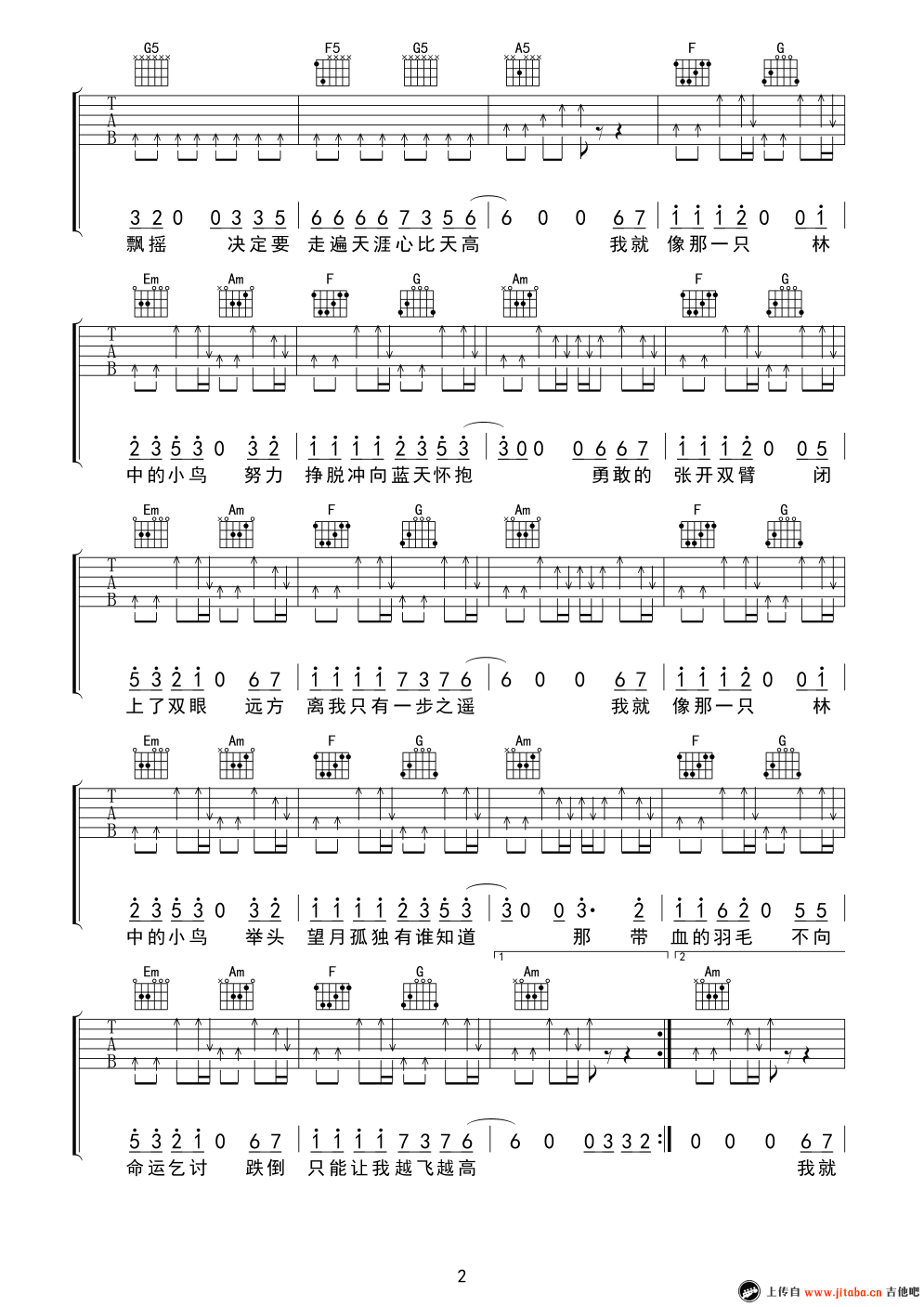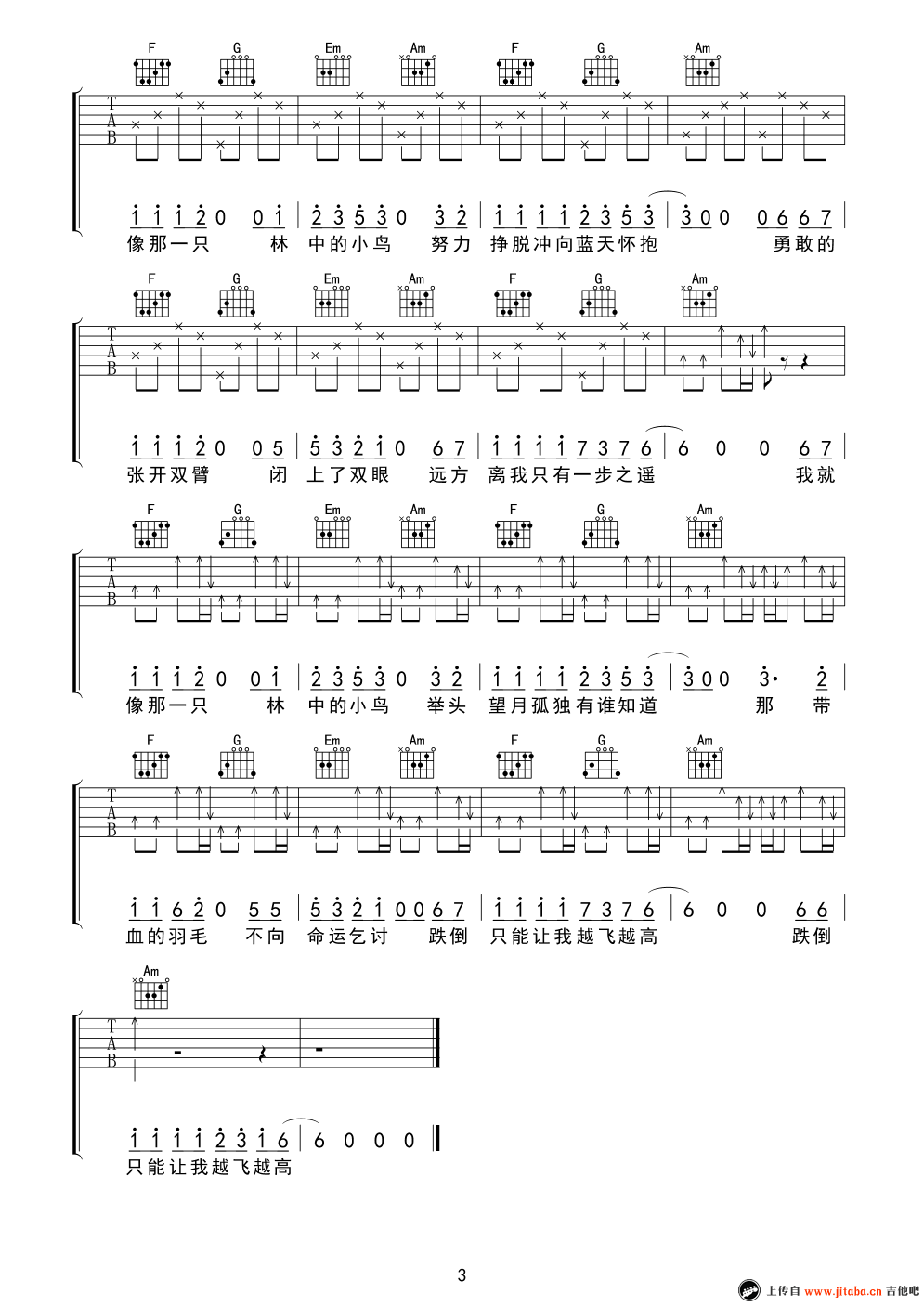 曲谱介绍: 《林中鸟》吉他谱是根据歌手葛林的一首经典歌曲编配的吉他谱。谱子采用C调指法编配,非常好听的一首歌曲。曲调高昂,是首非常励志的歌曲。喜欢的朋友收藏一下哦,琴谱网编辑整理。