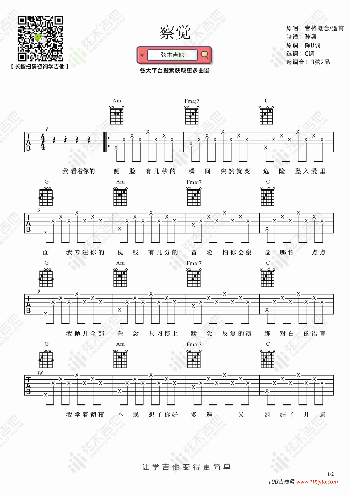 曲谱介绍: 察觉吉他谱是根据歌手音格概念和逸霄共同演唱的一首网络歌曲编配的谱子。歌曲采用C调指法编配,原调bB调。这首歌曲唱出了那心中对某人的喜欢,但却不敢说出口的感觉。喜欢的朋友弹唱一下哦。感谢弦木吉他编配此谱子,琴谱网整理上传。