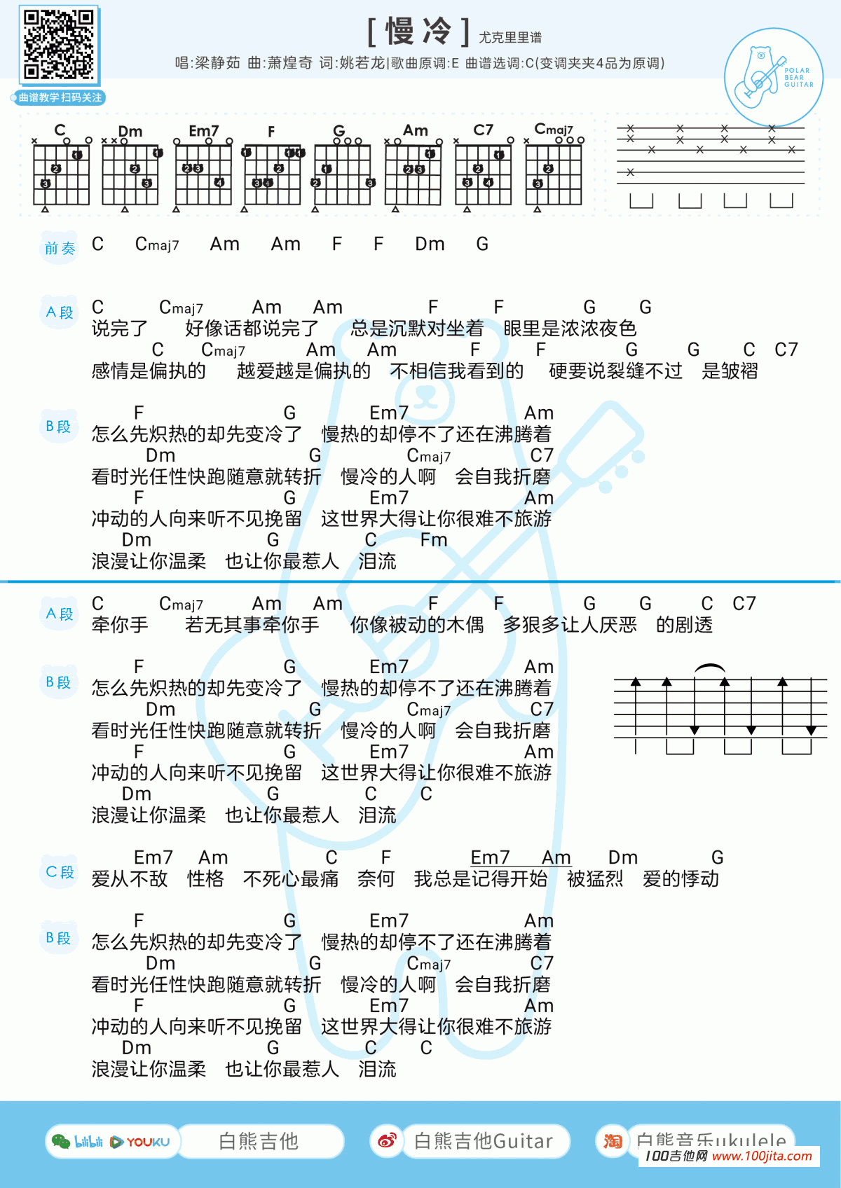 曲谱介绍: 慢冷吉他谱是根据歌手梁静茹的一首新歌编配的谱子,歌曲采用C调指法编配。非常好听的一首新歌。梁静茹那柔美的嗓音演唱这首歌曲很合适的,在加上吉他的伴奏你会发现简直是吉他弹唱的经典曲目。喜欢的朋友弹唱一下哦。共吉他谱和尤克里里谱两个版本,琴谱网编辑整理。
