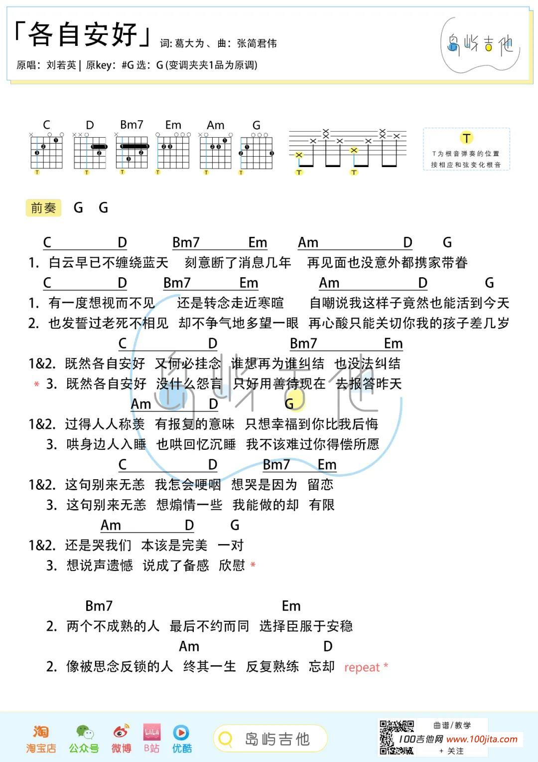 曲谱介绍: 各自安好吉他谱是根据歌手刘若英的一首新歌编配的吉他谱。相遇的时候是甜蜜的但是最终走到最后的人未必是她。之祝愿彼此各自安好。这首歌曲是刘若英于2021年3月24日发行专辑《各自安好》。这张专辑也是刘若英阔别六年后首张专辑。还是延续了她之前的音乐风格。让人听者格外亲切舒服。但是不同于之前的心境,讲述的是爱情回归时期的情感感受。喜欢的朋友弹唱一下哦。谱子还是比较不错。