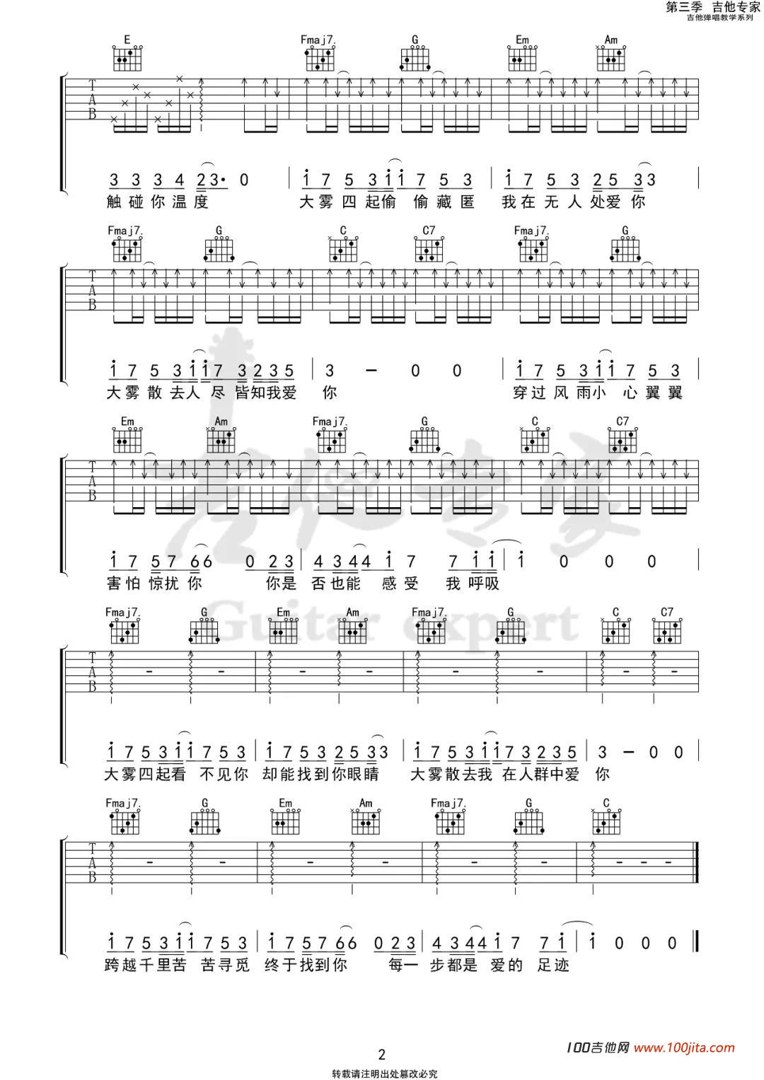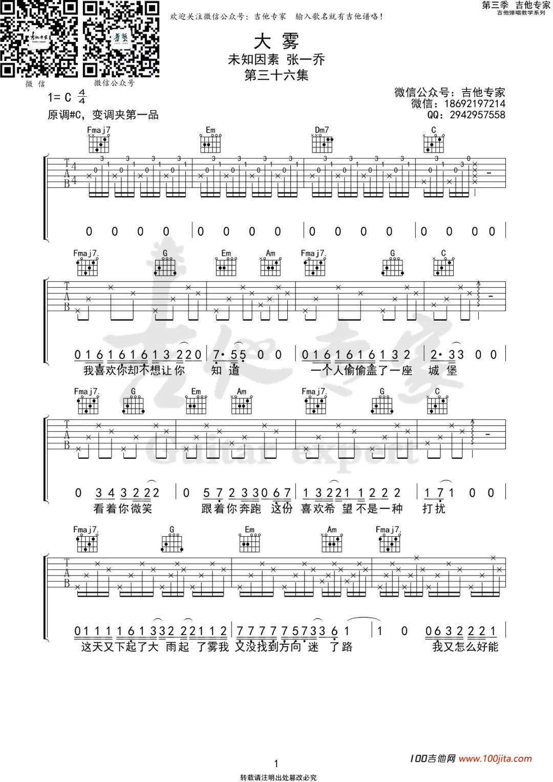 曲谱介绍: 大雾吉他谱是根据歌手未知音素和张一乔合唱的一首经典歌曲编配的吉他谱。歌曲原调#C调,谱子采用C调指法编配。变调夹夹一品回原调。一首不错的歌曲。最近网上很火的版本。此谱子是吉他专家编配的六线谱。共两张高清图片谱。喜欢的朋友收藏一下哦,琴谱网编辑整理。新增无限延音版