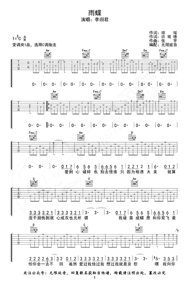 曲谱介绍: 李翊君《雨蝶》吉他弹唱谱,采用C调指法编配,共有3张高清图谱。