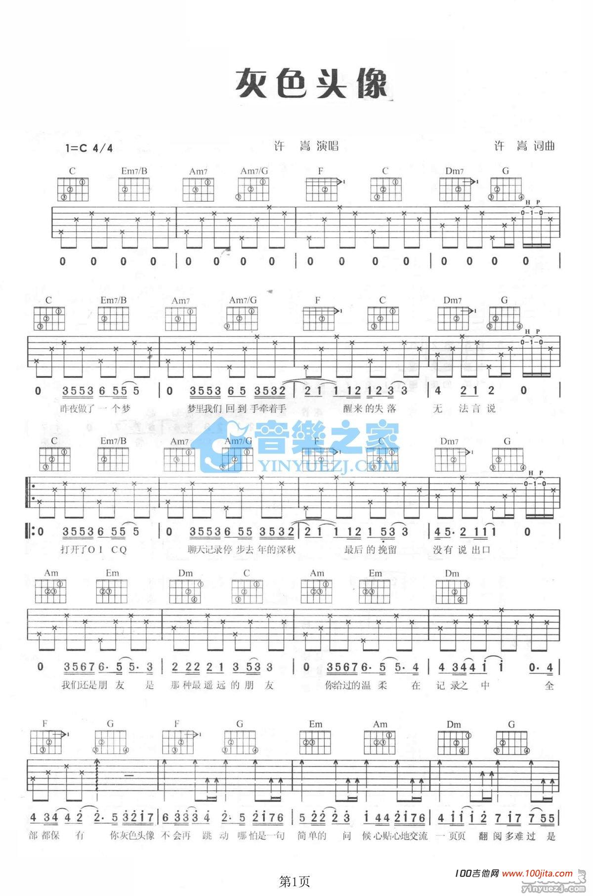 灰色头像吉他谱 - 许嵩 - C调吉他弹唱谱