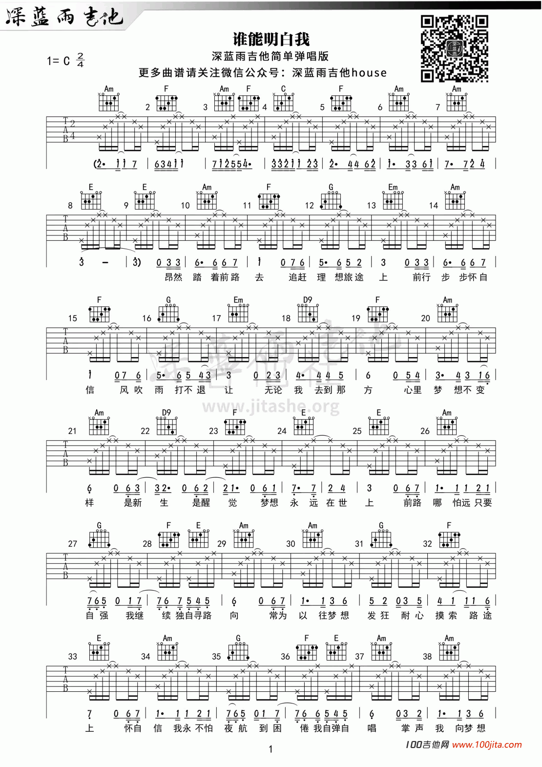 曲谱介绍: 谁能明白我吉他谱是根据歌手林子祥的一首经典歌曲编配的谱子。选用C调指法编配。非常好听的一首经典歌曲。林子祥的歌曲向来都是比较高亢有力的,这首歌曲也延续了他之前的风格,喜欢的朋友弹唱一下哦。谱子还是写的很棒的。琴谱网编辑整理。