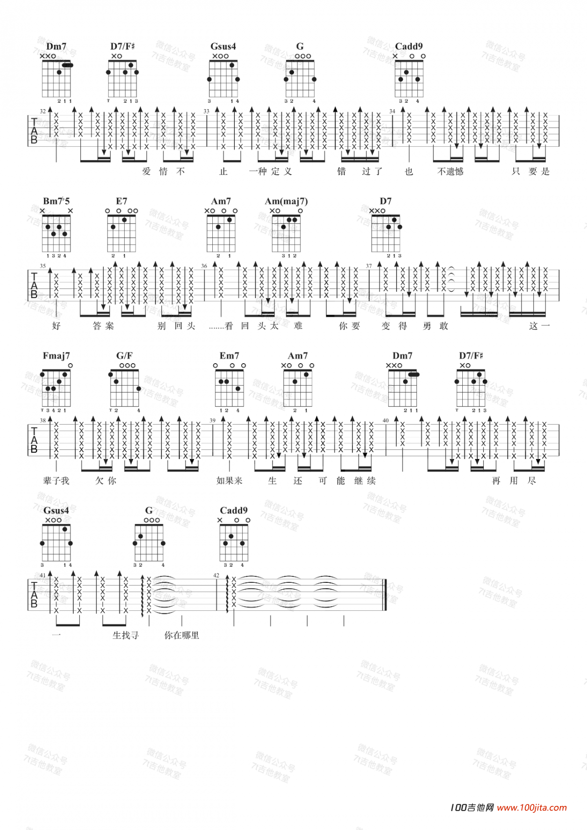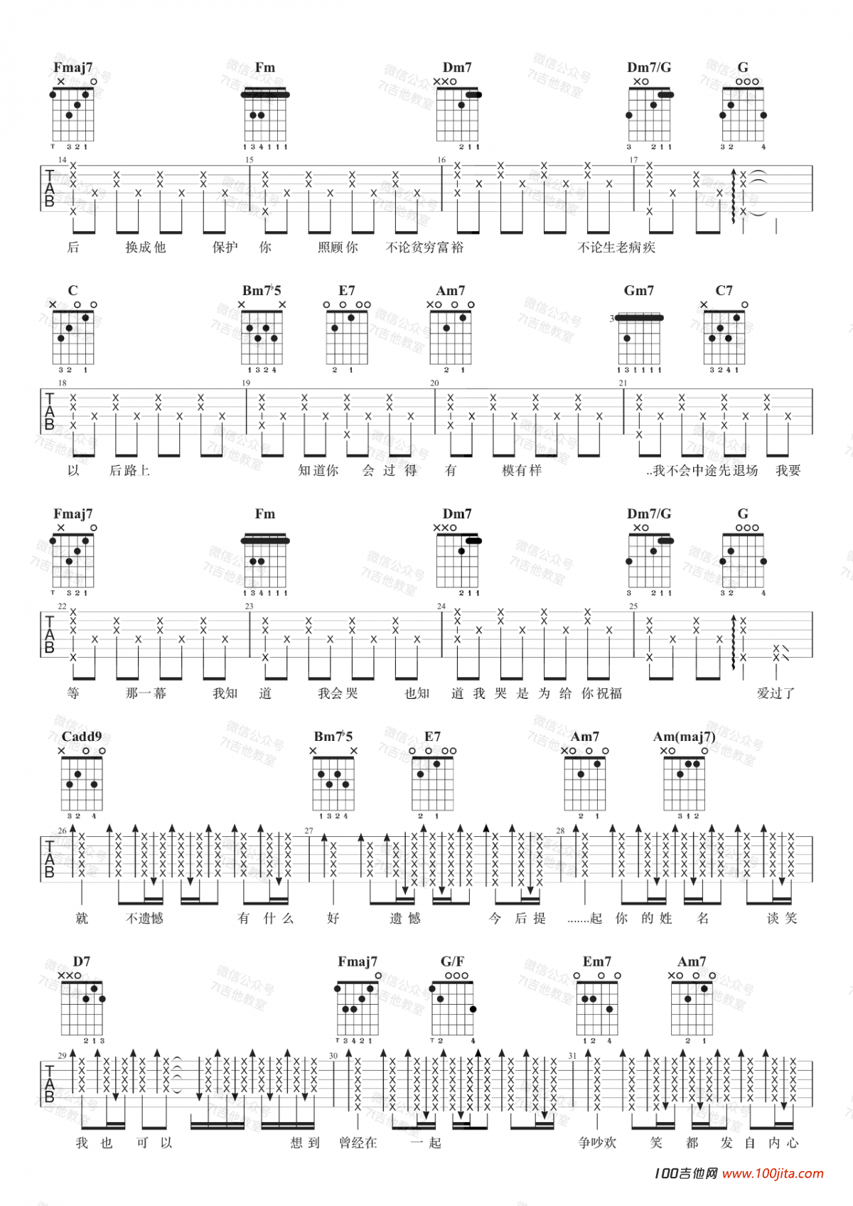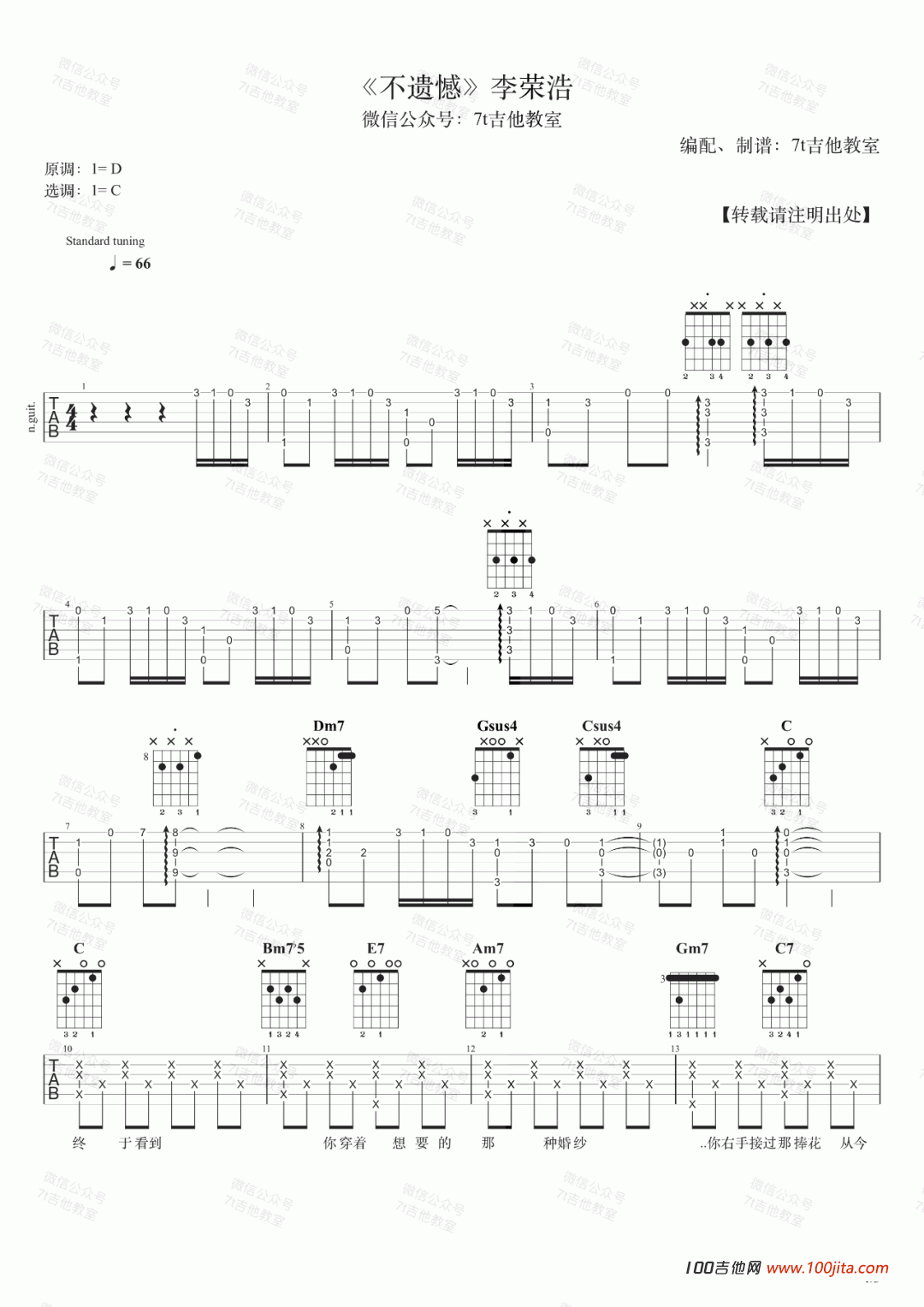 曲谱介绍: 不遗憾吉他谱是根据歌手李荣浩的一首经典歌曲编配的吉他谱。歌曲原调D调,谱子选用C调指法编配。这首歌曲也是点电影《你的婚礼》的主题曲。歌曲那种伤感相信会感染每一个听众。谱子里的和弦进行也是非常好的,大家多研究哦。喜欢这首谱子的朋友收藏一下哦。7T吉他教室编配,琴谱网编辑整理。