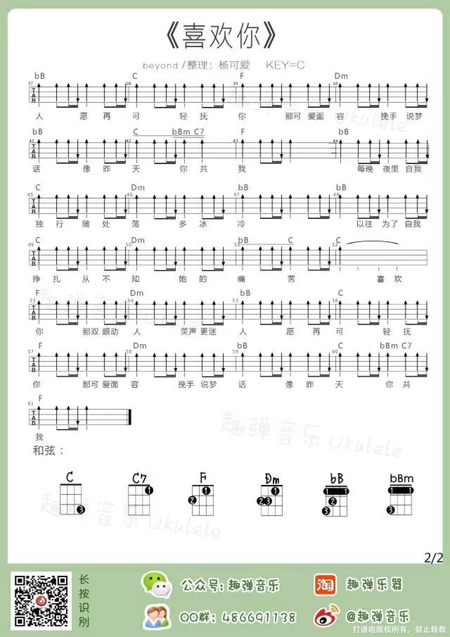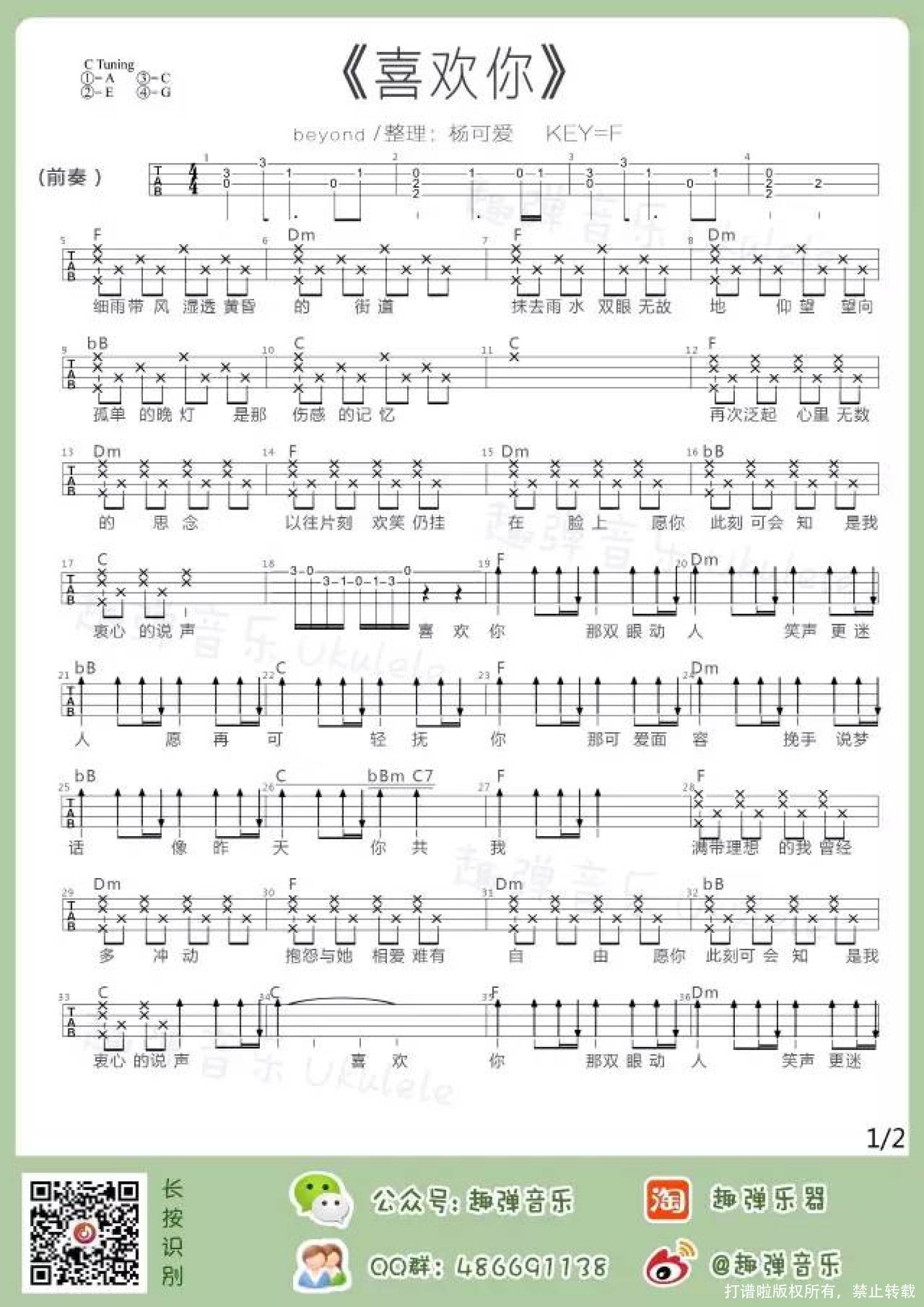 曲谱介绍: Beyond《喜欢你》_F调尤克里里谱
