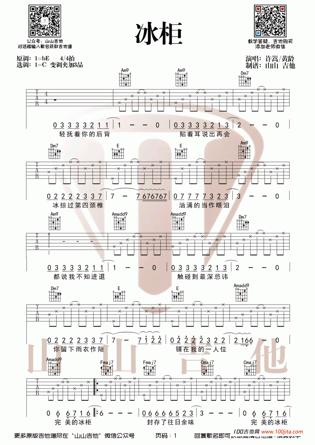 曲谱介绍: 冰柜吉他谱是根据歌手许嵩和黄龄共同演唱的一首经典歌曲编配的吉他谱。采用C调指法编配。共两站图片六线谱。歌曲有着令人寒冷的格调,听者好像那幽深空灵的感觉。喜欢的朋友弹唱一下哦。不错的歌曲,山山吉他编配吉他谱,琴谱网滨技整理。