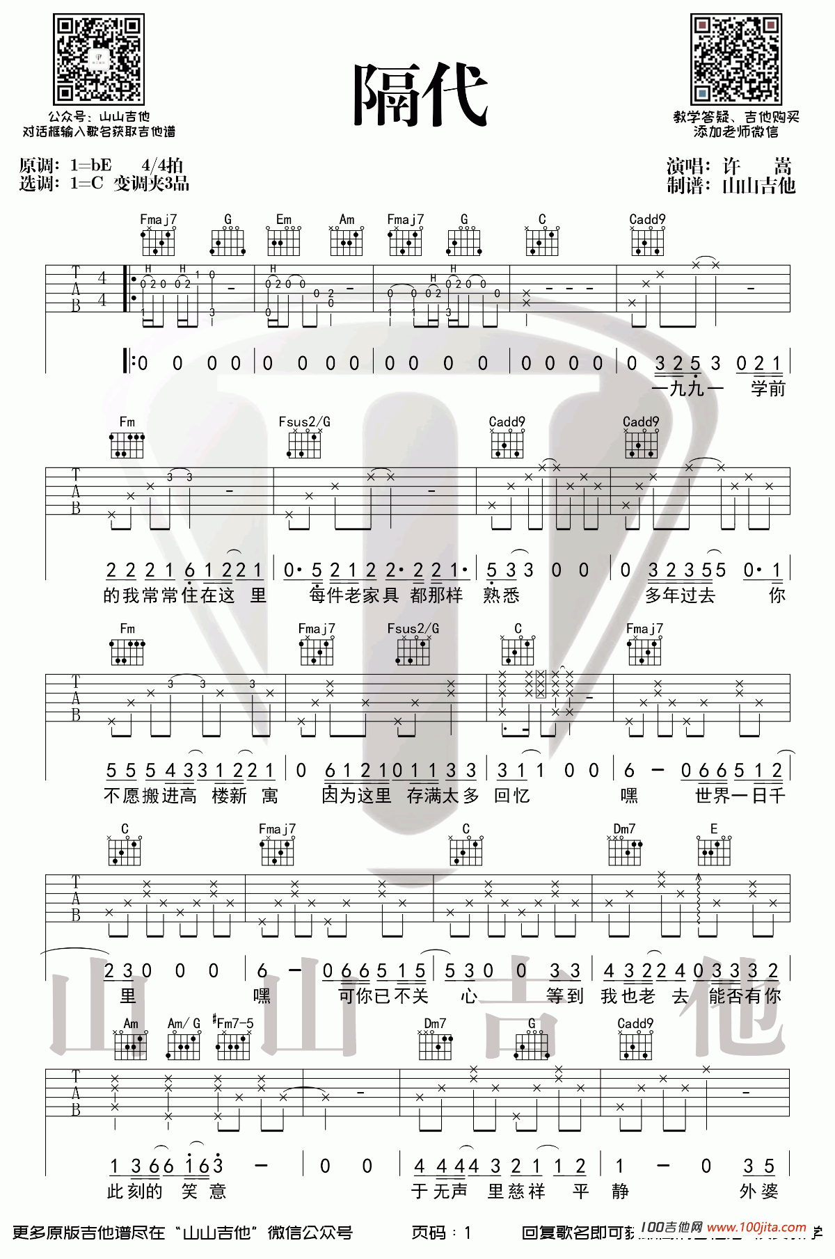 曲谱介绍: 隔代是根据歌手许嵩的一首经典歌曲编配的吉他谱。谱子选用C调指法编配。非常好听的一首歌曲。也是许嵩最新的专辑《呼吸之野》的一首经典作品。弹奏的时候建议变调夹三品。许嵩的歌曲总能抓住你的情感脉搏。琴谱网编辑整理,共两张图片六线谱。
