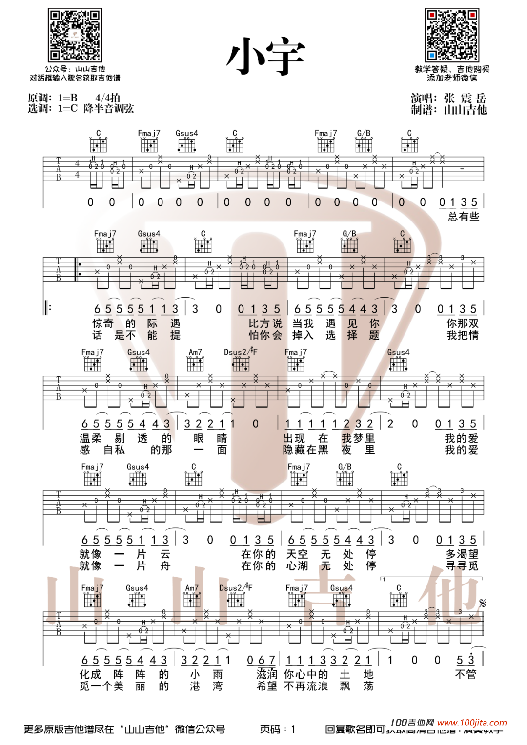 曲谱介绍: 小宇吉他谱是根据歌手张震岳的一首经典爱情歌曲编配的吉他谱。选用C调降半音调弦。喜欢的朋友弹唱一下哦。山山吉他编配此吉他谱,琴谱网编辑整理。