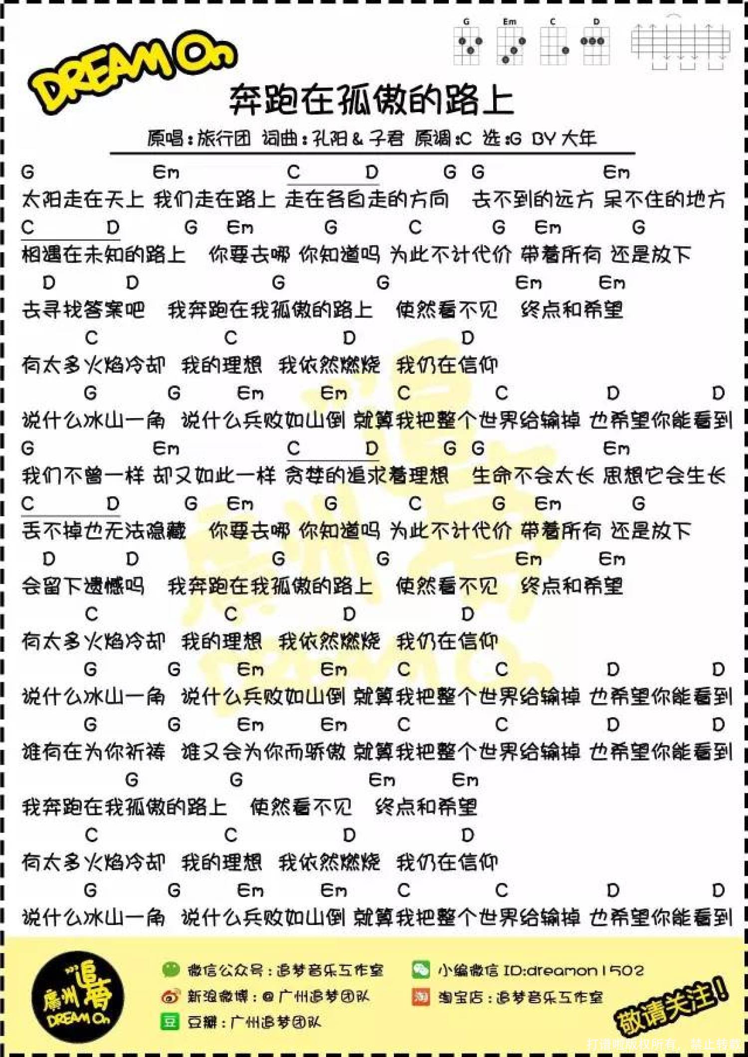 曲谱介绍: 旅行团乐队《奔跑在孤傲的路上》_G调尤克里里谱