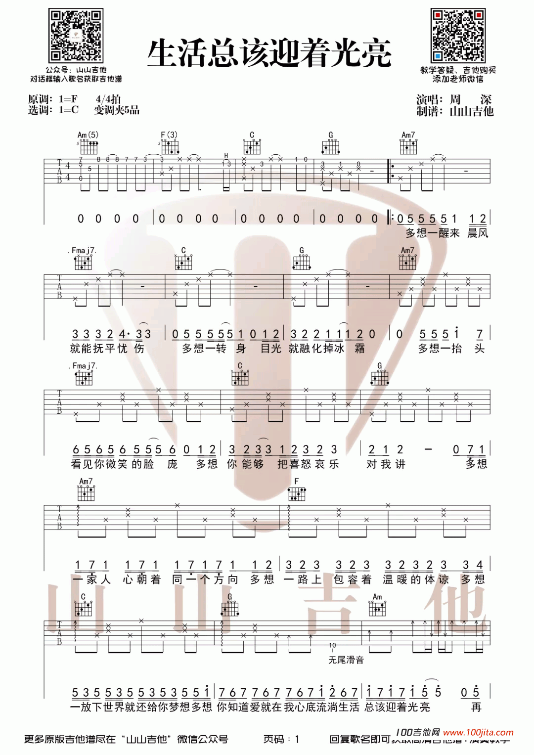 曲谱介绍: 周深《生活总该迎着光亮》吉他弹唱谱,采用C调指法编配,共有2张高清图谱,免翻页排版设计。