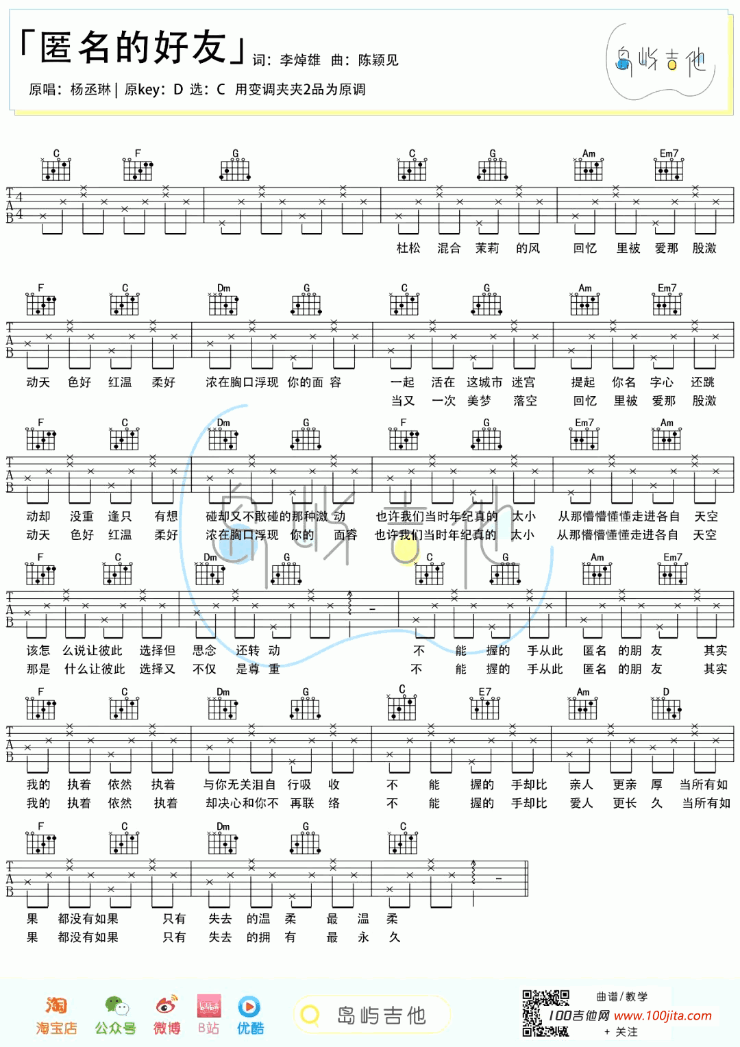 曲谱介绍: 杨丞琳《匿名的好友》吉他弹唱谱,采用C调指法编配,共有2张高清图谱,免翻页排版设计。
