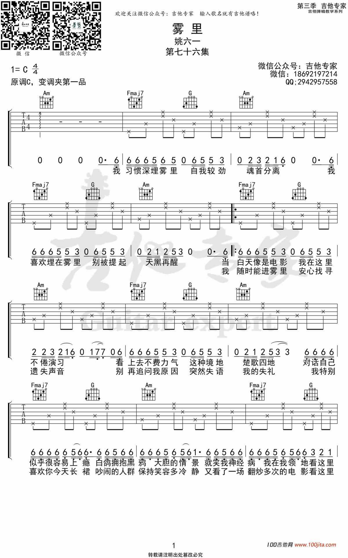 曲谱介绍: 姚六一《雾里》吉他弹唱谱,采用C调指法编配,共有2张高清图谱,免翻页排版设计。